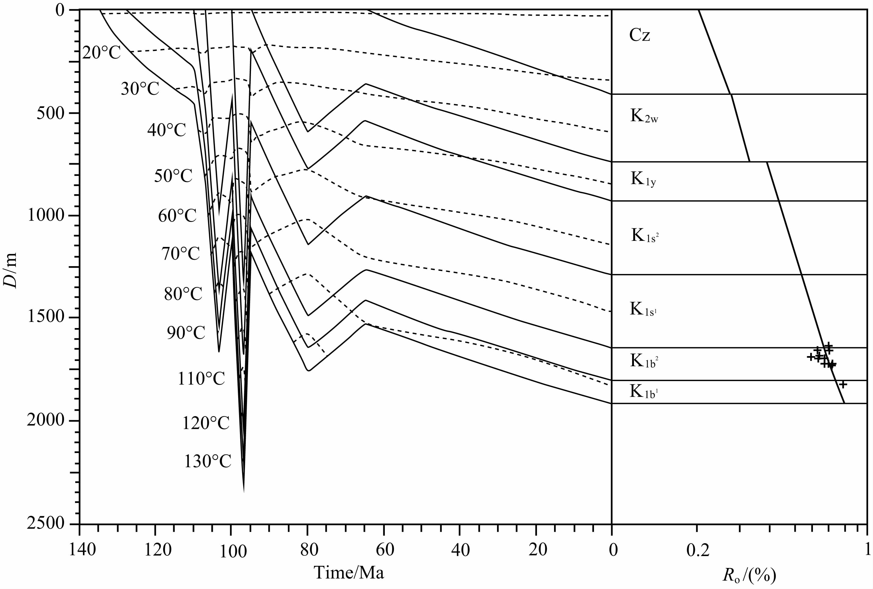 岩石热物理参数主要包括岩石热导率、岩石生热率等参数(左银辉等,2013b),地层分层采用钻孔实际测量值,各地层底界年龄数据具体为:新生界(Cz)65 Ma,上白垩统乌兰苏海组(K2w)95 Ma,下白垩统银根组(K1y)100 Ma,下白垩统苏红图组二段(K1s2)105 Ma,下白垩统苏红图组一段(K1s1)110 Ma,下白垩统巴音戈壁组二段(K1b2)128 Ma,下白垩统巴音戈壁组一段(K1b1)135 Ma(图 1c).
