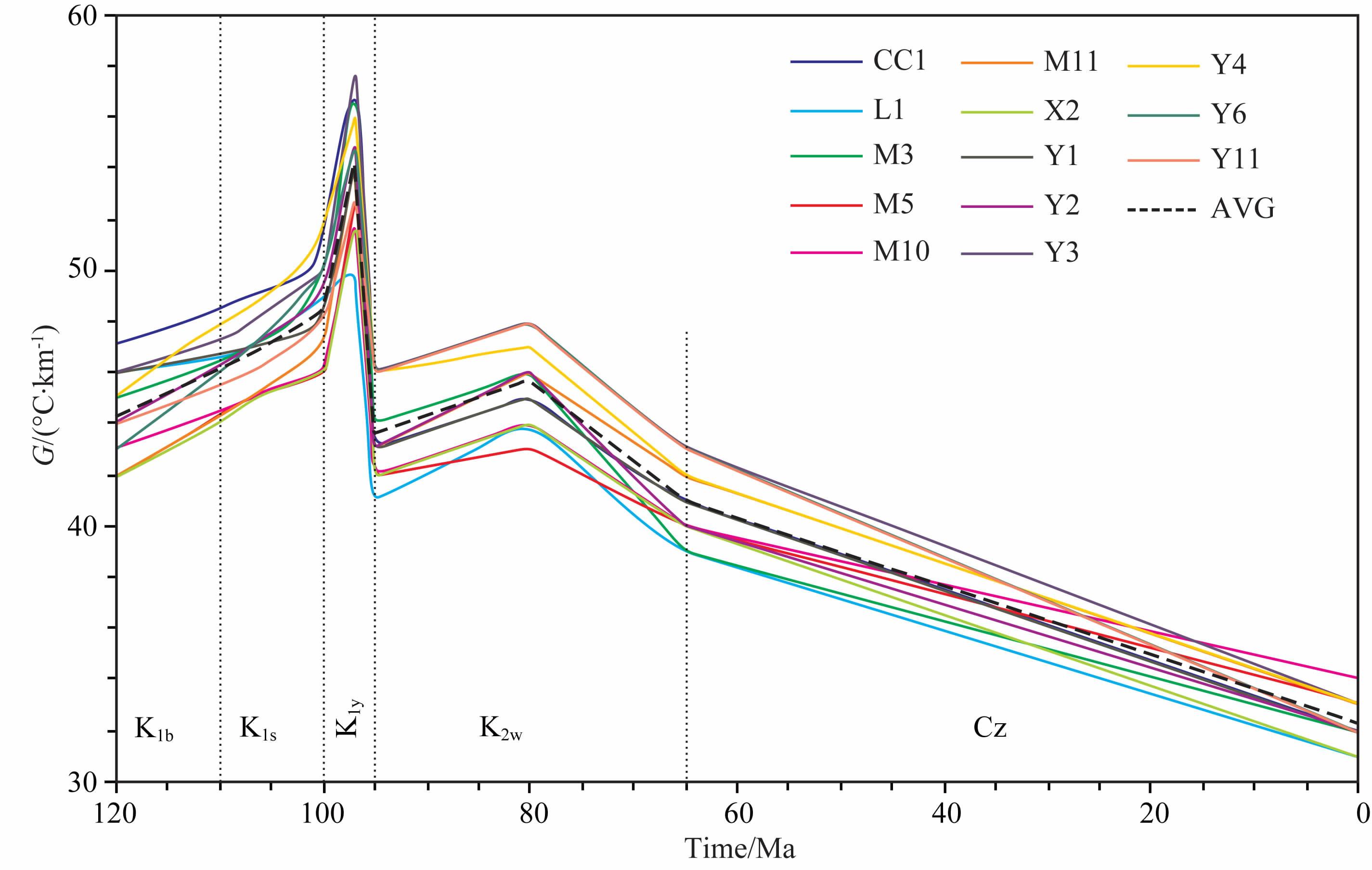 此外,利用以上的方法还模拟了11口井的热史,模拟结果显示查干凹陷经历了以下4个热演化阶段(图 9):(1)巴一段-苏红组沉积时期(K1b-K1s):地温梯度快速增加阶段,地温梯度由巴音戈壁组沉积开始的42~47 ℃/km逐渐增加至苏红图组沉积末期的46~52 ℃/km;(2)银根组沉积时期(K1y):地温梯度高峰阶段,此时地温梯度达到50~58 ℃/km,具有裂陷构造区的热流状态;(3)乌兰苏海组沉积时期(K2w):高地温延续阶段,地温梯度为 39~48 ℃/km,这是由于乌兰苏海组较厚的新沉积 物具有低的岩石热导率,使得在乌兰苏海组的地温梯度略有升高,在中晚期构造抬升,地温梯度又开始降低;(4)新生代(Cz):热沉降阶段,此阶段主要受喜山构造运动的影响,查干凹陷主要处于抬升剥蚀期,新生代沉积较薄,地壳处于均衡调整期,地温梯度逐渐降低,现今为31~34 ℃/km,具有偏高的古地温梯度.