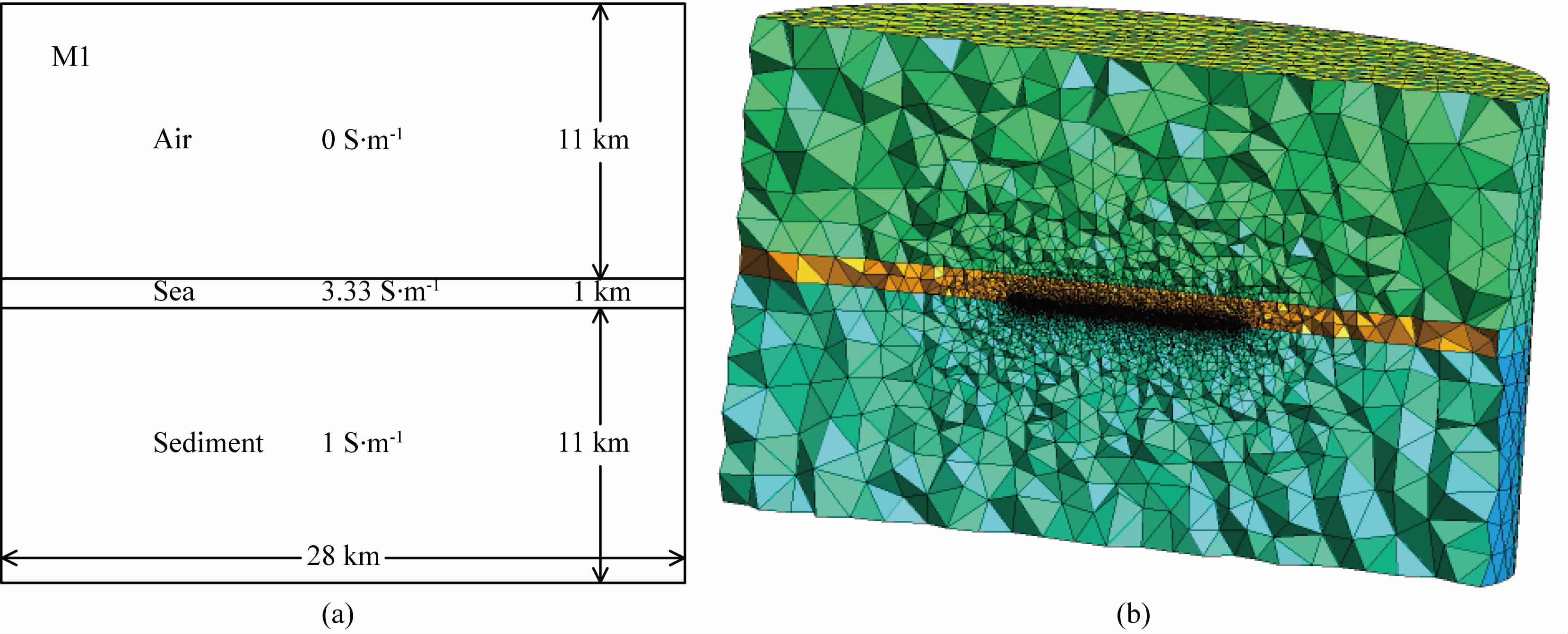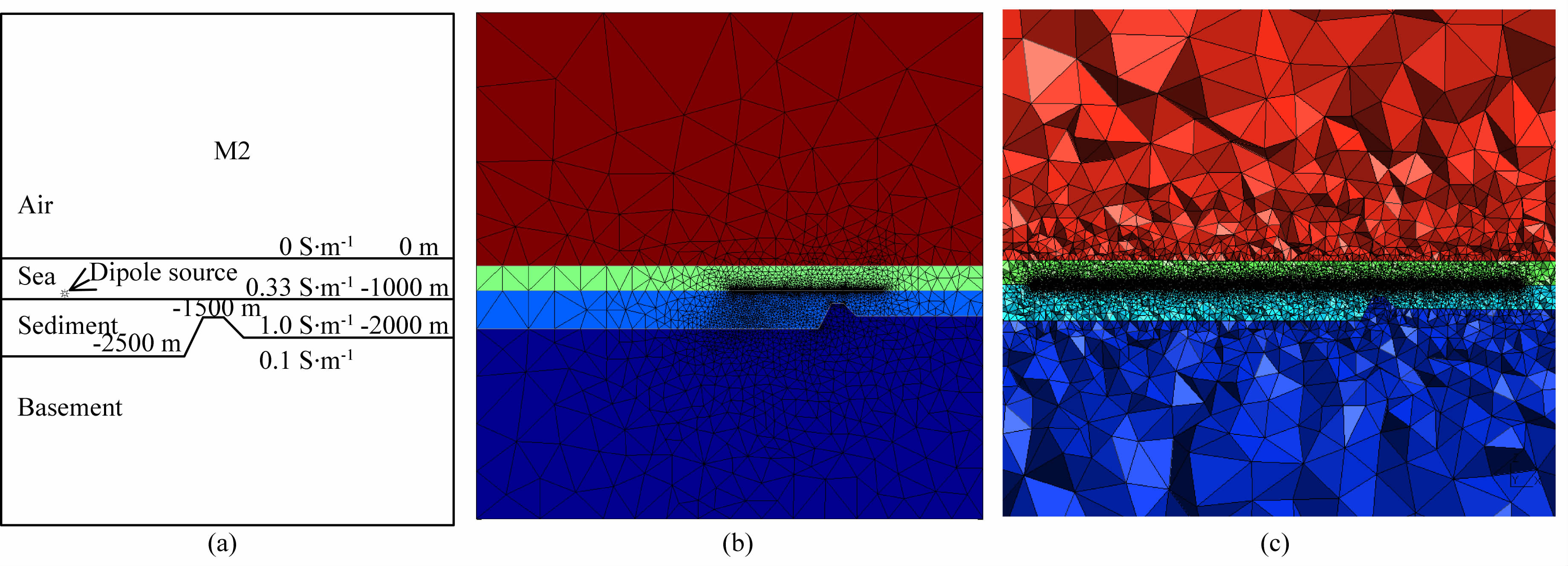图 4 (a)M2模型简图;(b)MARE2DCSEM采用的二维网格,由上到下分别为空气层(红色)、 海水层(绿色)、沉积层(天蓝色)和基底(深蓝色);(c)矢量有限元正演采用的三维网格 Fig. 4 (a)Sketch of the M2 model;(b)The triangular meshes applied in 2D FE algorithm MARE2DCSEM.Layers from top to bottom are air(red),sea(green),sediment(sky blue) and basement(deep blue);(c)Tetrahedral meshes applied in our 3D simulation |