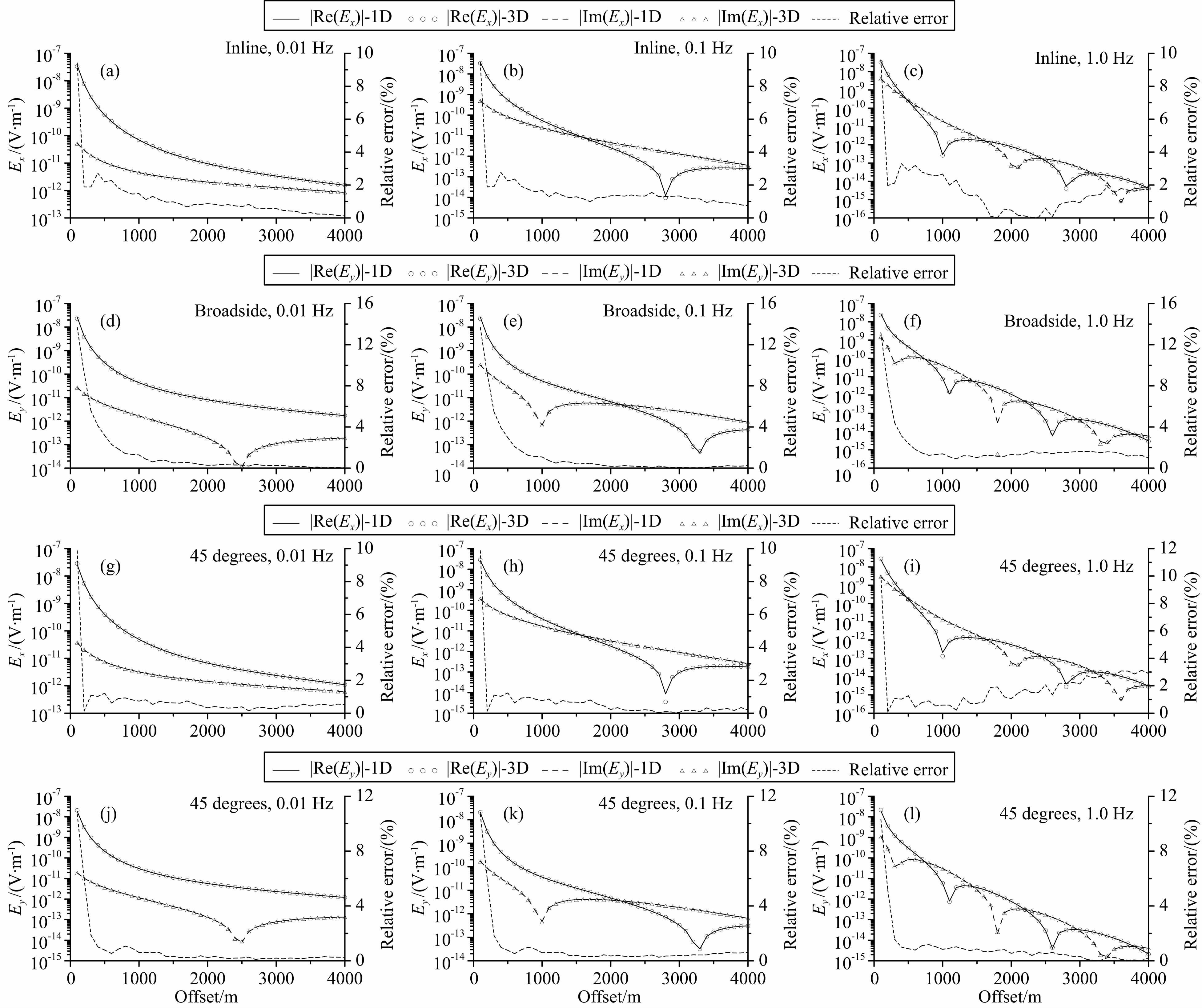 为了验证有限元算法的正确性并分析计算精度,我们设计了M1模型(空气-海水-沉积层模型),其几何与物理参数如图 2a所示.由于偶极子源产生的场具有一定的对称性,我们将有限元算法的计算域设计为圆柱体状.相比常规的六面体,在相同半径下,采用圆柱体可以减小计算域,从而减少网格节点,提高求解效率.偶极子源置于距海底50 m高 处,测线置于海底,沿x方向布置,测点间距为50 m. 图 2b是利用开源网格生成程序Gmsh(Geuzaine and Remacle,2009)生成的网格,生成网格时在源和测线附近进行了局部加密处理,最终M1模型被离散成700704个四面体,共118191个节点,821044条边.计算中采用了三种装置:(1)inline装置,即电偶极子源与测点共线,且偶极子方向与测线方向一致;(2)broadside装置,即电偶极子源与测点共线,且偶极子方向与测线方向垂直;(3)电偶极子源与测点共线,且偶极子方向与测线方向成45°夹角.我们分别计算了发射频率为0.01 Hz、0.1 Hz和1.0 Hz的偶极子源产生的电场.分配8个主频为2.4 GHz的处理器做并行计算时,单个频点的计算时间约为2.0 min.图 3给出了不同装置、不同发射频率的电场数值解与解析解的对比.