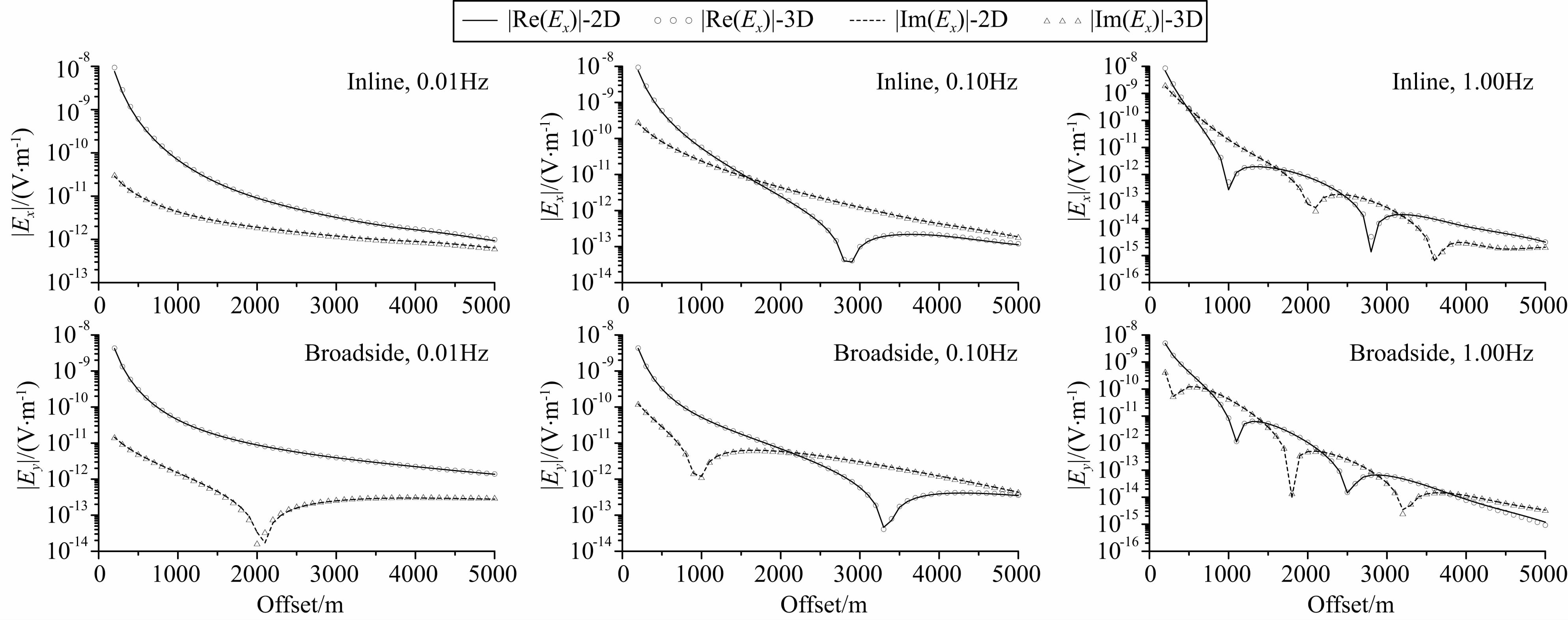在M1模型的基础上,我们设计了如图 4所示的二维模型M2.相比M1,M2多了一个电阻率为10 Ωm的基底层,基底层与沉积层之间是一个起伏界面.左侧界面距离海底1.5 km,右侧界面距离海底1.0 km,中部存在一个宽度为1.5 km的地垒状突起.这个二维模型中电偶极子源产生的电磁场无法得到精确的解析解,我们选择了将矢量有限元的数值模拟结果与国际上知名的海洋电磁二维自适应非结构有限单元程序MARE2DCSEM(Li and Key,2007)的计算结果进行对比,以验证我们程序的正确性.如图 5所示,无论是inline装置还是broadside装置,我们的计算结果都和MARE2DCSEM的吻合得很好.