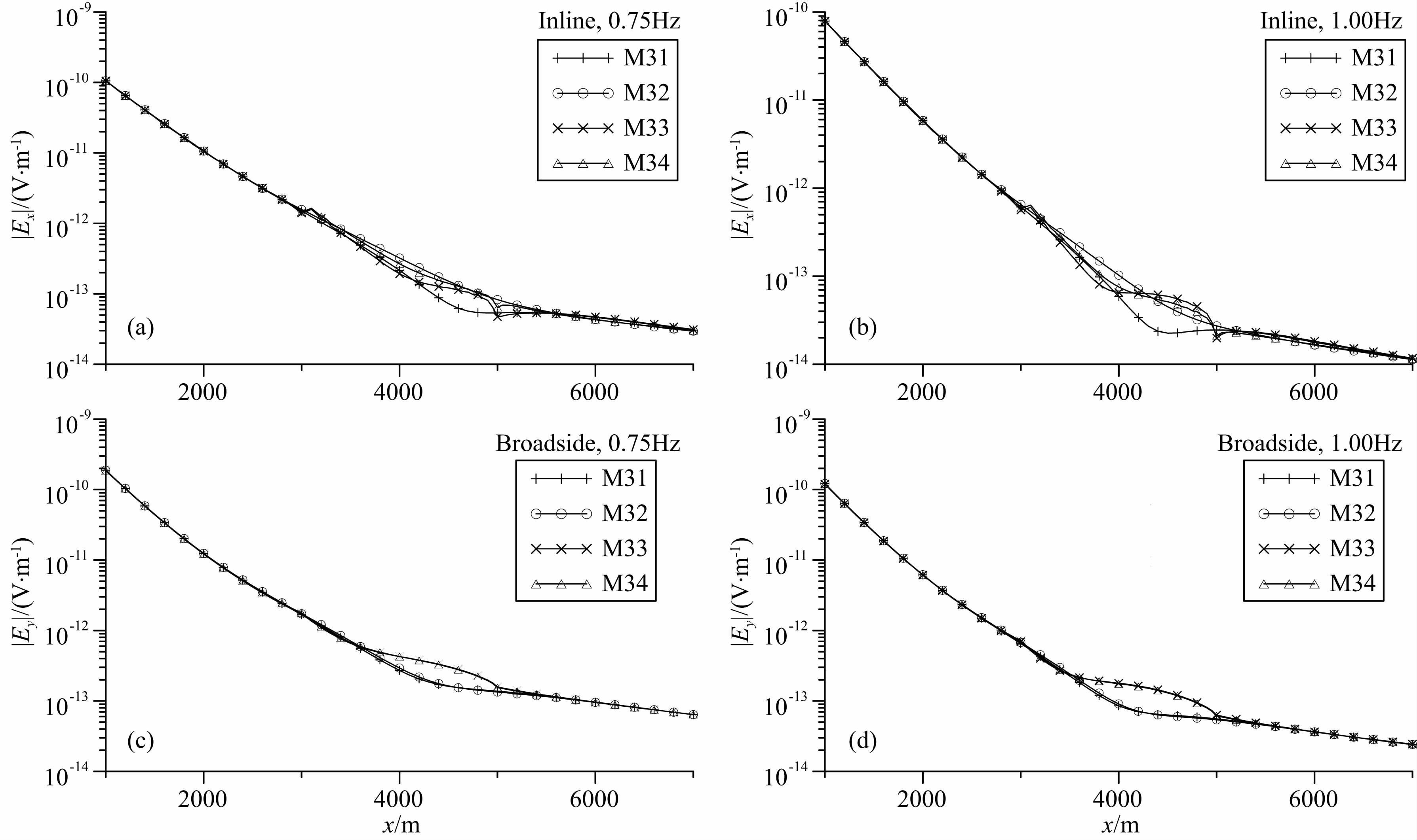 实际海底地形条件远比前面讨论的模型复杂,为此有必要分析海底地形对海洋CSEM勘探实测数据的影响.为此,我们设计了如图 6所示的M3系列模型,其中M31为无油藏的水平层状模型,海水深度1000 m,M32在M31基础上加入了油藏模型,M33在M31基础上加入了一个半椭球状的凸起地形,M34则在M33的基础上添加了油藏模型.位于沉积层内的油藏利用一个高阻的扁平椭球体模拟,中心坐标为(4000,0,-2000),长半轴a=2000 m,沿x方向,b=1000 m,沿y方向,c=100 m,沿z方向.M33和M34模型中的半椭球形凸起地形位于 油藏正上方,长半轴a=2000 m,沿y方向,b=1000 m,沿x方向,c=200 m,沿z方向.电偶极子源置于(-1000,0,-950)处,根据油藏埋深,我们选择了0.75 Hz和1.0 Hz两个发射频率,分别计算了inline和broadside装置的电场.位于海底的测线沿x轴布置,范围在x=1000 m到x=7000 m之间,点距100 m.图 7所示为数值模拟结果,从图 7(a-d)M31和M32曲线可以看到,inline模式下水平层状模型中油藏引起了明显MVO异常,而broadside模式下却未能获得明显的异常,这主要是因为油藏的长半轴沿x方向,因此y方向的异常要小于x方向.M31和M33曲线的差异表明地形对电场的影响很大,M33和M34曲线的对比表明地形的存在会削弱甚至掩盖油藏产生的MVO异常,因此当采用MVO曲线对潜在油藏做定性分析时,必须考虑海底地形的影响.