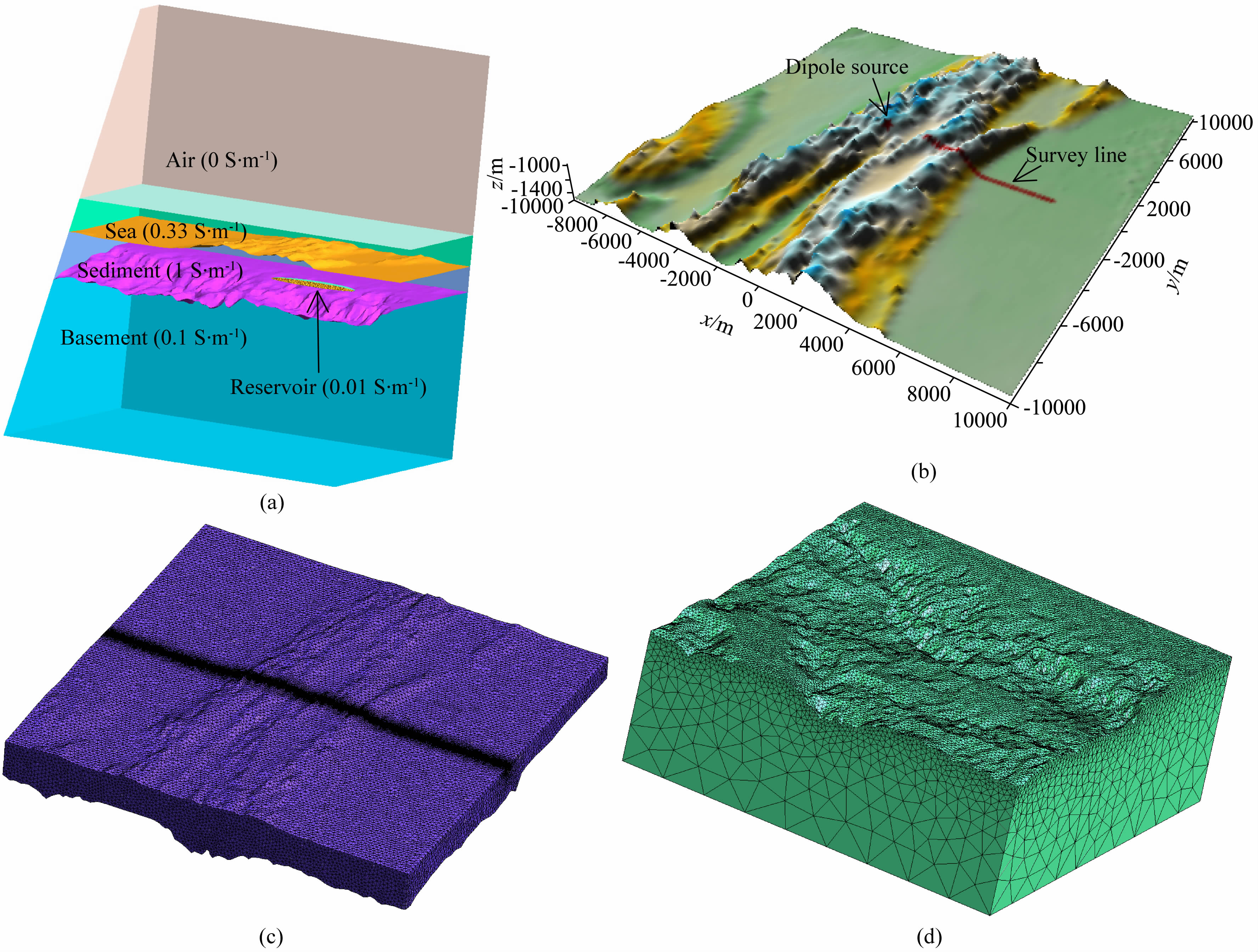 图 8 (a)带三维海底地形的海底油藏模型,图中浅蓝色平面为海平面,橙色界面为海底,紫色界面为沉积层与基地交界面;(b)海底地形及电偶极子源和测线的位置;(c)海底地形网格;(d)沉积层与基底界面地形网格 Fig. 8 (a)A reservoir model with 3D submarine and interface topographies. Interfaces from top to bottom are sea level(light blue),submarine(orange) and sediment-basement interface(purple);(b)Submarine topography and the survey geometry;(c)Meshes of the submarine topography;(d)Meshes of the interface topography between the sediment and basement |