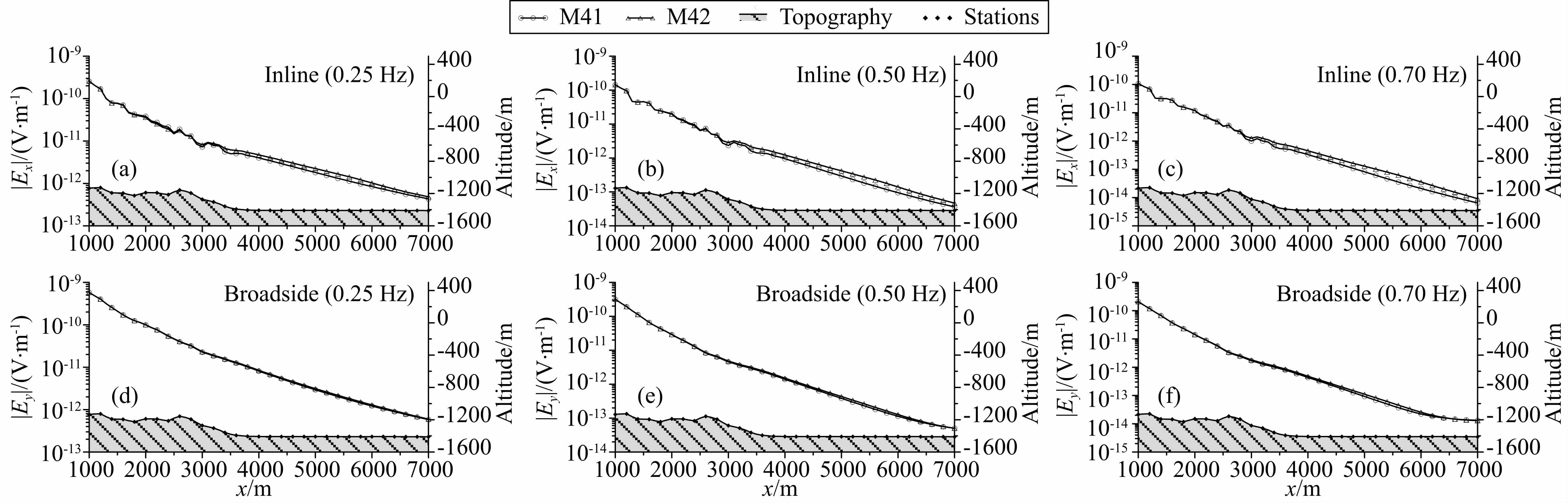 为了分析海底地形对海洋CSEM勘探的影响,我们设计了如图 8a所示的带海底地形的油藏模型.海水深度在931~1479 m之间,海底存在一个走向沿y轴的海岭,最大高差约为550 m,测线垂直海岭走向布置,长度为6 km(图 8b).沉积层和基底层的界面也存在地形起伏,其深度在2509~4088 m之间.位于沉积层内的油藏同样采用一个高阻的扁平椭球体模拟,其几何和物理参数与M3系列模型中的一样.为了提高数值模拟精度,在生成非结构四面体网格时对两个起伏界面的所有高程控制点均进行了加密处理,测线所在剖面也进行了网格加密,详见图 8c、8d.为了分析地形的影响和MVO曲线对海底油藏的响应,我们分别对不存在海底油藏(M41)和存在海底油藏(M42)两种情况进行了数值模拟.我们选取了0.25 Hz、0.50 Hz和0.70 Hz三个发射频率,计算结果如图 9所示.