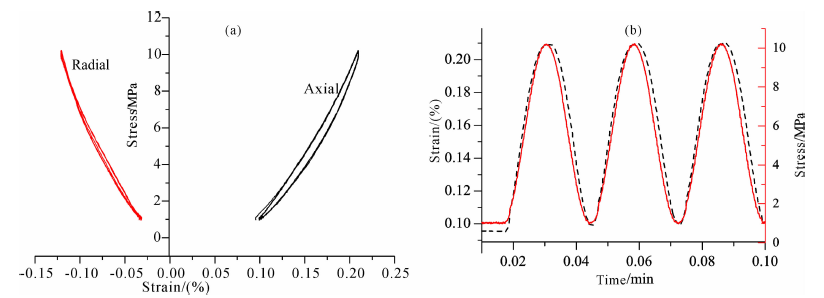 3 实验结果分析 3.1 加载与卸载滞后效应图 2为泥岩在频率为0.2 Hz条件下,静载为1 MPa、动载为10 MPa的循环荷载下岩石的应力σ-轴向和径向应变ε曲线.干燥岩石在循环荷载作用下的应力-应变关系呈现叶状的滞后回线,说明干燥岩石为一种多孔渗水的、有裂隙的材料,与铝、钢等金属材料不同,在不同的程度上都具有滞后的特性,滞后不仅存在于应力-轴向应变之间,也存在于应 力-径向应变之间.在循环荷载情况下,岩石在应力-应变图中出现的滞后回线是由于循环荷载时应力和应变的相位不同步的缘故,在加载阶段,应变的相位可能落后于、相等于、或者超前于应力的相位;在卸载阶段,应变的相位都落后于应力的相位.无论何种情况,应力-应变相位差在加载和卸载时不是相等的,这说明了外部荷载在应力方向反转时应变的相位进行了调整,因此应力-应变滞后回线在荷载反转处是尖叶状的.加载和卸载的差异是由于滞后效果产生的,因为岩石是在压力条件下压实,岩石的结构已经承受了所处位置的最高压力,因此在更高压力条件下岩石才会变形,因此滞后行为反应了岩石经受的最大应力,但是这种滞后的简单解释不能完全诠释实验结果.首先加载和卸载过程的差异既使在压力低于现场压力条件下也能观测到,另外岩石曾经在更大的深度、更高的压力条件下,因此理论上不应该观测到滞后行为.这种观测结果显示页岩气储层岩石在地质时间尺度经历了去压实过程,地质时间尺度的去压实是可能的,因为这些储层由于碳氢化合物的产生会导致明显的超压,使得孔隙空间扩展,更短的去压实可能是由于非弹性应变恢复的效果.