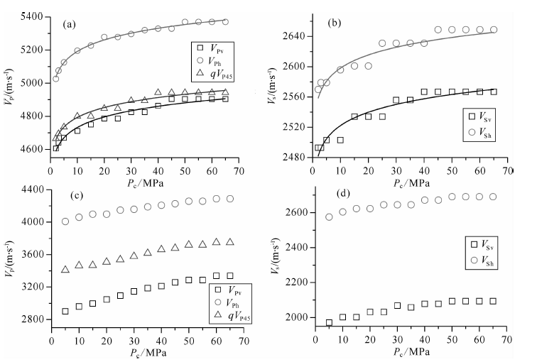图 3 (a)泥岩样品干燥条件下不同方向纵波速度随压力变化,(b)泥岩样品干燥条件下不同方向横波速度随压力变化,(c)页岩样品干燥条件下不同方向纵波速度随压力变化,(d)页岩样品干燥条件下不同方向横波速度随压力变化 Fig. 3 Variations of velocities in different directions with pressure,(a)VP of dry mudstone,(b)VS of dry mudstone,(c)VP of dry shale,(d)VS of dry shale |