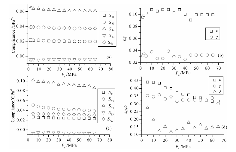 图 4 泥岩(a,b)与页岩(c,d)岩样韧度(a,c)与各向异性参数(b,d)随围压变化 Fig. 4 Compliances and anisotropy parameters versus confining pressure,(a) and (b)Mudstone,(c) and (d)Shale |