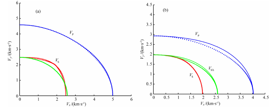 图 5 泥岩(a)和页岩(b)的相速度和群速度(其中相速度和群速度分别对应实线和虚线) Fig. 5 Phase(solid line) and group(dashed line)velocities of mudstone(a) and shale(b) |