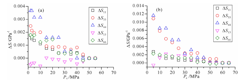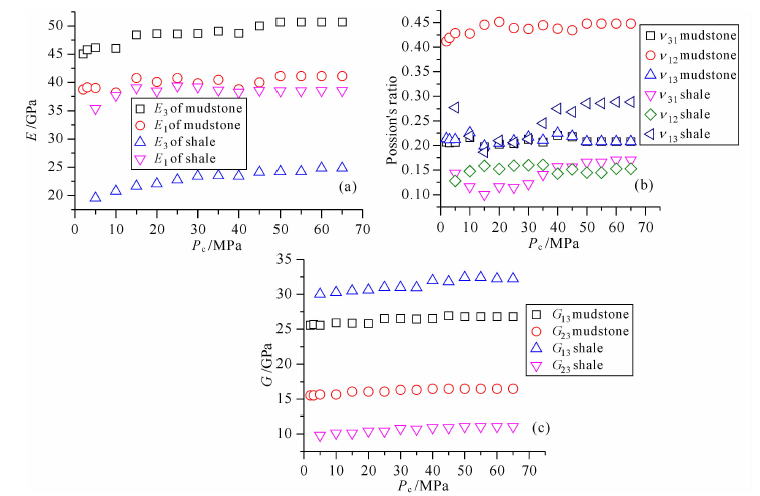 动态弹性模量在低压条件下随着围压的增加有硬化趋势,这主要是由于软裂隙空间的闭合.动态测量中超声波传播过程应变幅度小于10-7,是材料在试验中一个确定点的快照式测量,动态模量的改变能够研究弹性孔隙结构随压力的变化.图 6a给出了动态杨氏模量随着围压的变化,杨氏模量随着围压的增大而增大,在低压阶段增大的幅度相对更大;在围压大于40 MPa时,动态杨氏模量趋于一个稳定值.由于平行于层理面的裂纹闭合导致动态杨氏模量各向异性减少,在高压下仍然存在层理导致的杨氏模量的固有各向异性.图 6b给出了动态泊松比随着围压的变化,当围压大于40 MPa时,达到一个稳定值.图 6c给出了动态剪切模量随着围压的变化,G13和G23随着围压的增大而增大,但是随着围压的增大其变化率减小.