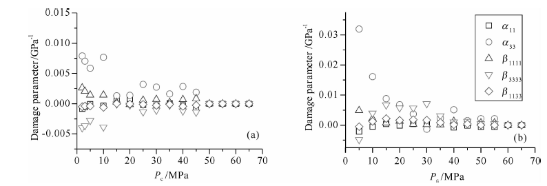 图 8 围压加载条件下的损伤参数变化 (a)泥岩;(b)页岩. Fig. 8 ariations of damage parameters under hydrostatic loading (a)Mudstone;(b)Shale. |