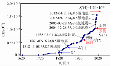 图 10示出了该地震区当前周期经误差修正后标志性地震事件之间的力学联系(秦四清等,2016a).根据1818年11月8日印度尼西亚巴厘海MS8.5级地震发生前的CBS值,可较准确地连续预测到1861年2月16日拉贡迪MS8.5级地震、1938年2月1日班达海MW8.5级地震与2004年12月26日苏门答腊西海岸MW9.0级地震的临界CBS值.根据秦四清等(2014a)提出的主震事件判识原则,判断该区当前孕育周期存在第4锁固段,当其被加载至峰值强度点时,应发生标志性地震事件.