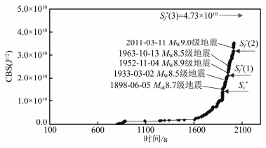 图 11示出了该地震区当前孕育周期经误差修正后标志性地震事件之间的力学联系(秦四清等,2016a).根据1898年6月5日日本海沟Muk8.7级地震前的CBS值,可较准确地连续预测到1952年11月4日勘察加东部近海MW8.9级地震与2011年3月11日日本宫城东部近海MW9.0级地震的临界CBS值.根据秦四清等(2014a)提出的主震事件判识原则,判断该区当前孕育周期存在第3锁固段,当其被加载至峰值强度点时,应发生标志性地震事件.