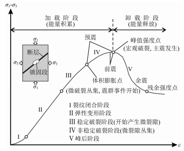图 4 三轴压缩下岩石(锁固段)变形破坏过程示意图 Fig. 4 Schematic illustration of deformation and failure process of rock (locked patch) under triaxial compression |