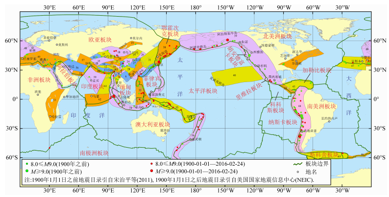 图 6 全球主要地震区划分图(2.0版)(秦四清等,2016d) Fig. 6 Division map of main seismic zones in the world (Version 2.0) (Qin et al., 2016d) |