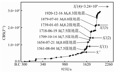 图 7示出了该地震区当前孕育周期经误差修正后标志性地震事件之间的力学联系(秦四清等,2016c).根据1561年8月4日宁夏中宁东MS7.5级地震发生前的CBS值,可较准确地连续预测到1654年7月21日甘肃天水南MS8.0级地震、1739年1月3日宁夏平罗MS8.2级地震与1920年12月16日宁夏海原MW8.3级地震的临界CBS值.根据秦四清等(2014a)提出的主震事件判识原则,判断该区当前孕育周期存在第4锁固段,当其被加载至峰值强度点时,应发生标志性地震事件.