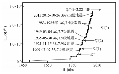 图 8示出了该地震区当前孕育周期经误差修正后标志性地震事件之间的力学联系(秦四清等,2016c).根据1909年7月7日阿富汗巴达赫尚MW7.9级地震发生前的CBS值,可较准确地连续预测到1921年11月15日巴达赫尚MW7.9级地震、1949年3月4日法扎巴德MW7.7级地震与巴达赫尚1983年12月30日/1985年7月29日MW7.5级双震的临界CBS值.根据秦四清等(2014a)提出的主震事件判识原则,判断该区当前孕育周期存在第4锁固段,当其被加载至峰值强度点时,应发生标志性地震事件.