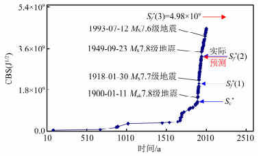图 9示出了该地震区当前孕育周期经误差修正后标志性地震事件之间的力学联系(秦四清等,2016b).根据1900年1月11日日本海Muk7.8级地震发生前的CBS值,可较准确地连续预测到1918年1月30日俄罗斯滨海边疆区MS7.7级地震与1949年9月23日日本海MS7.8级地震的临界CBS值.根据秦四清等(2014a)提出的主震事件判识原则,判断该区当前孕育周期存在第3锁固段,当其被加载至峰值强度点时,应发生标志性地震事件.