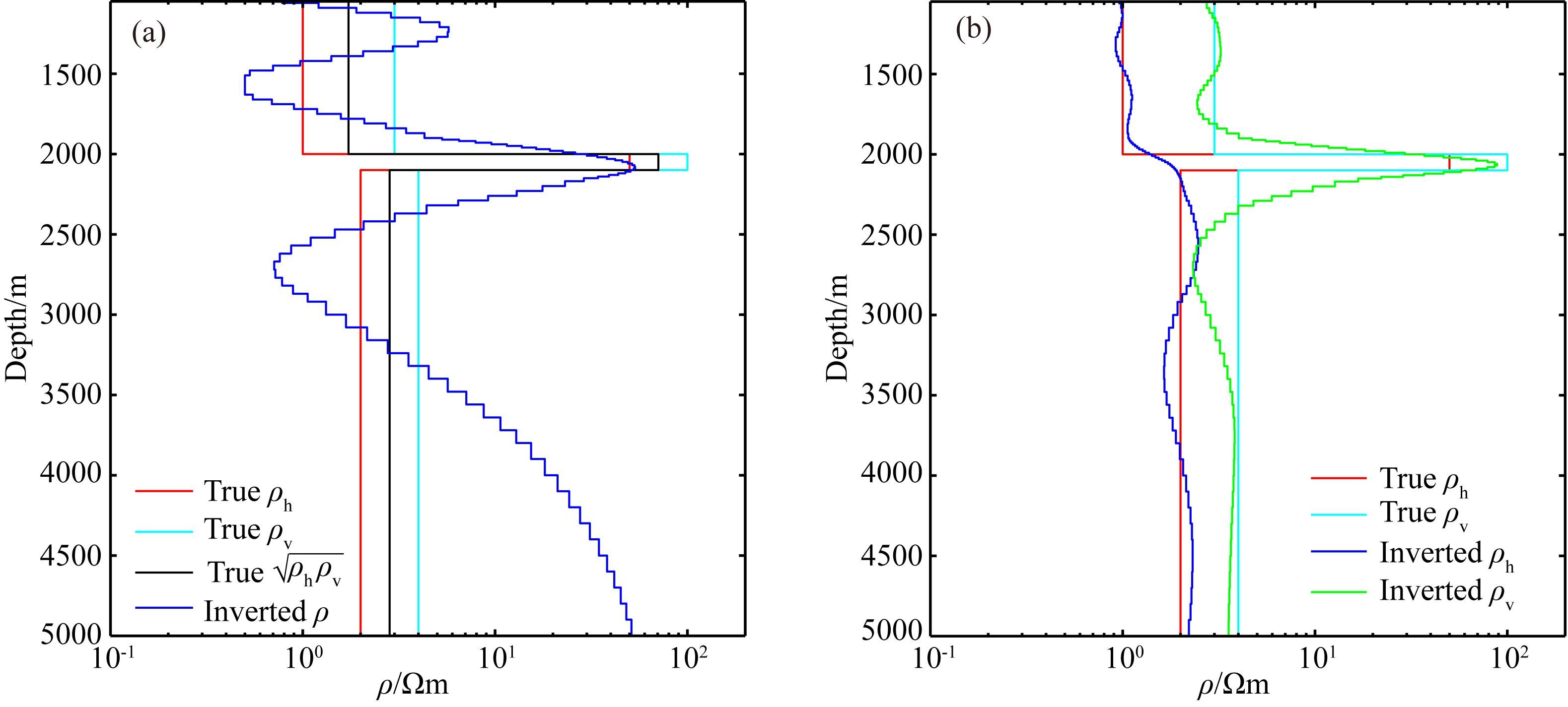 3.3 自适应正则化因子正则化因子 μ 的选择方式是能否获得合理反演结果的关键.在地球物理反演研究中,出现了许多正则化因子选择方法(Constable et al.,1987; Hansen,1992; Haber and Oldenburg,2000).本文将矩阵乘积 [(WdJ)T(WdJ)] 中各行总和的最大值作为正则化因子的基数(Newman and Alumbaugh,1997),再结合当前反演模型横向电阻率(ρh)与垂向电阻率(ρv)的关系调节不同反演参数的正则化因子大小,从而实现正则化因子的自适应选择.