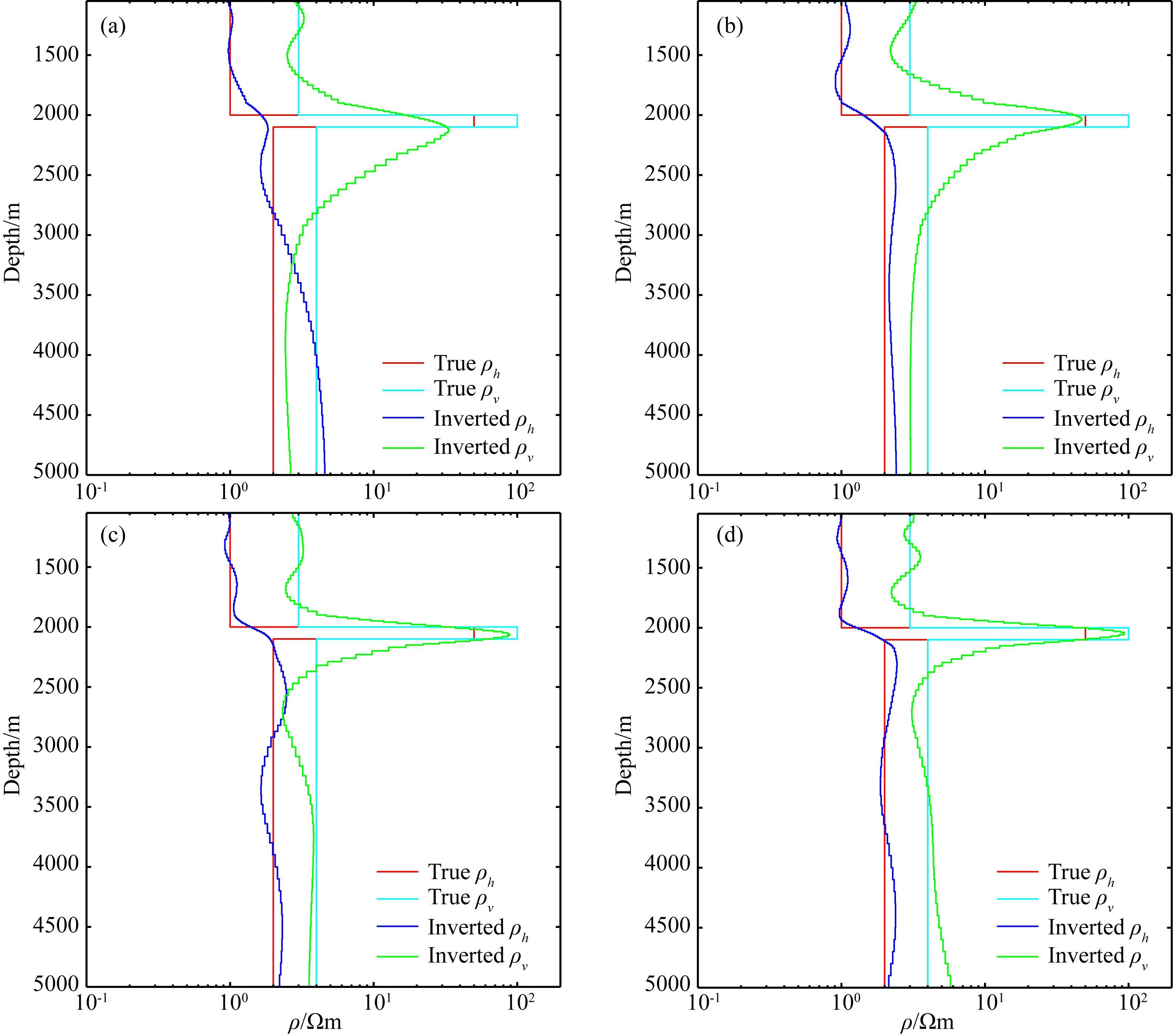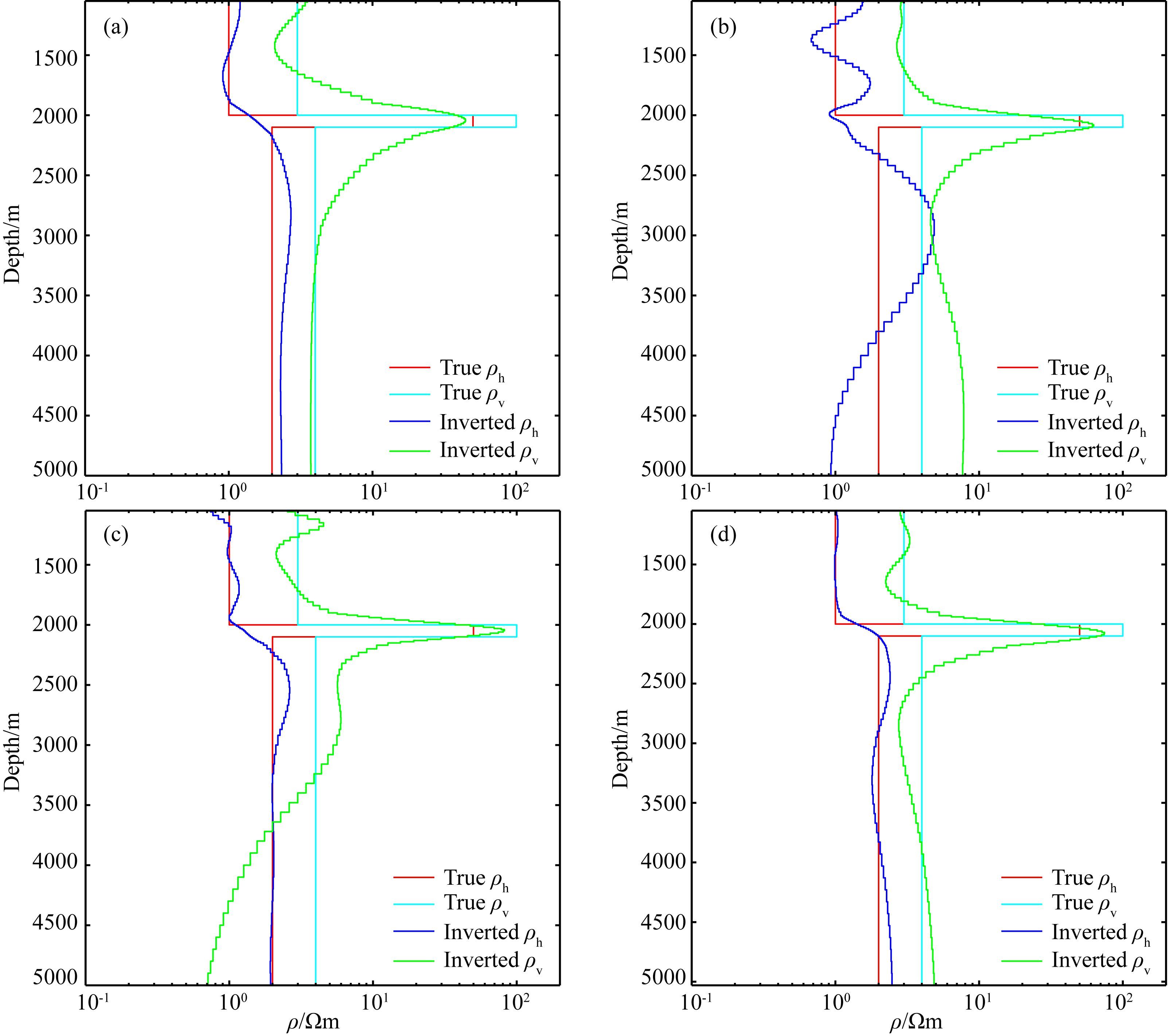 图 4 不同电磁场分量电阻率各向异性反演结果 (a)Ey反演;(b)Ez反演;(c)Bx反演;(d)Ey、Ez、Bx三分量反演. Fig. 4 Inversions of various EM components for the 1D anisotropic model (a)Ey;(b)Ez;(c)Bx;(d)Ey,Bx and Ez. |