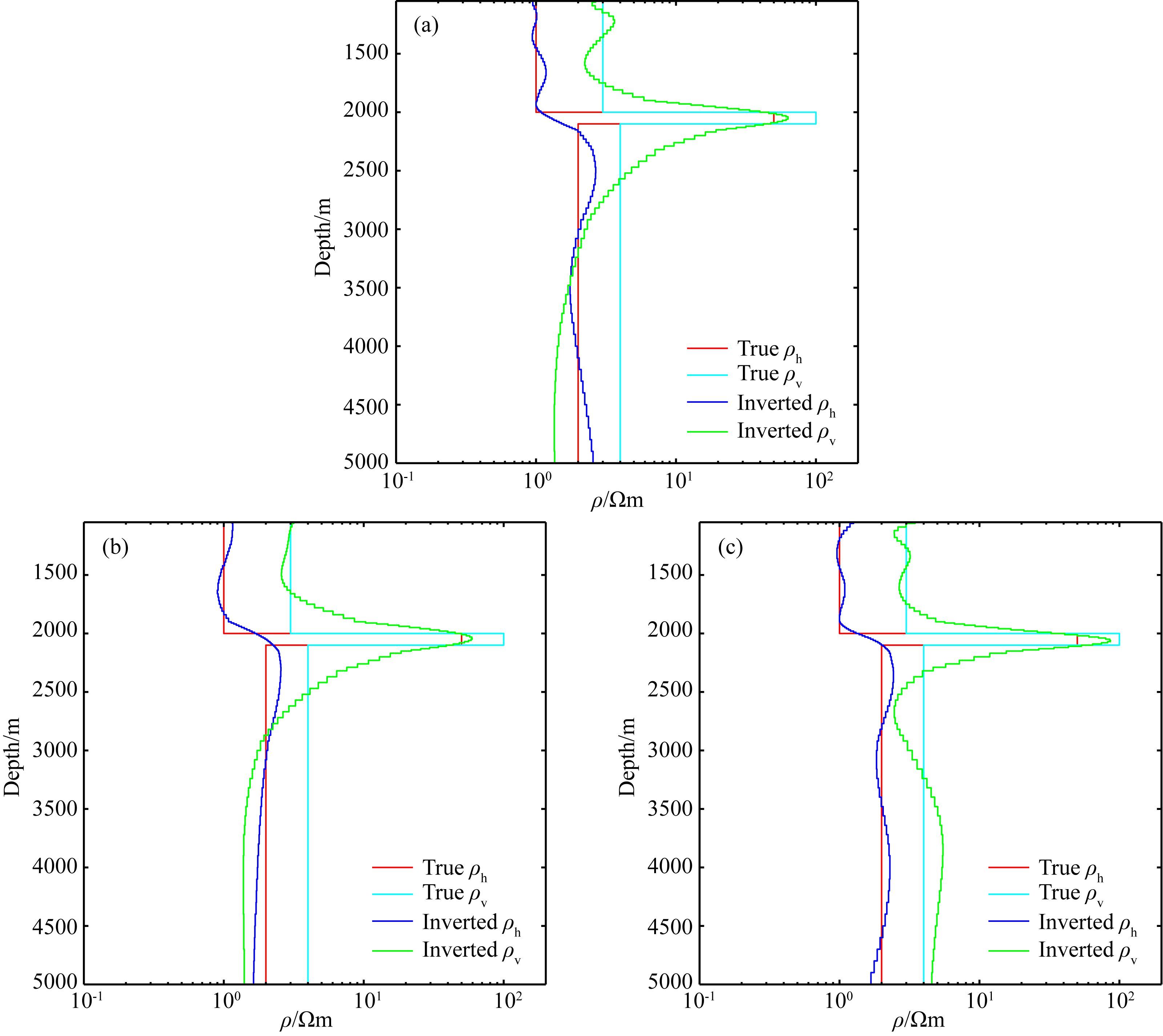 图 5 单一观测模式数据和混合观测模式合成数据的电阻率各向异性反演结果 Fig. 5 Inversion of multi-geometry EM data for the 1D anisotropic model (a)Inline-geometry data;(b)Broadside-geometry data;(c)Combined inline and broadside geometry data. |