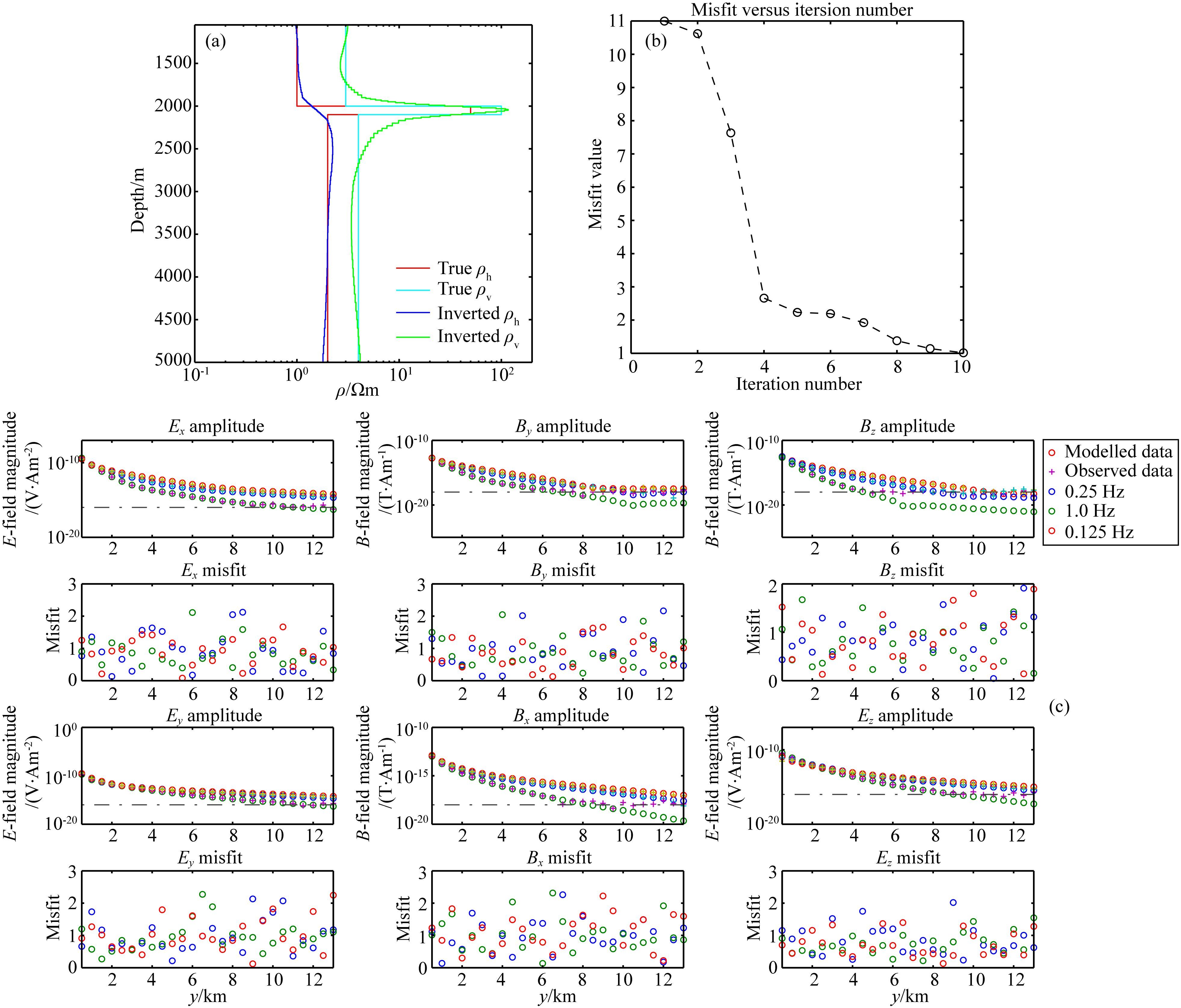 图 6 倾斜偶极源合成数据反演结果 (a)反演模型;(b)数据拟合差与反演迭代次数的变化曲线;(c)观测数据(“+”线)和反演模型正演响应(“o”线)的数据拟合情况(图 6c第一行和第三行),以及对应的数据拟合差(图 6c第二行和第四行). Fig. 6 Inversion of multi-component and multi-frequency data generated by a tilted dipole source (a)Inversion model;(b)Misfit versus iteration number;(c)Amplitude(first and third row)of three EM components(Ey,Ez,Bx)for the inversion model(‘o’)and observed data(‘+’). Dotted lines indicate the noise floor of corresponding EM components. Data misfits (second and forth row in c)are around 1.0. |