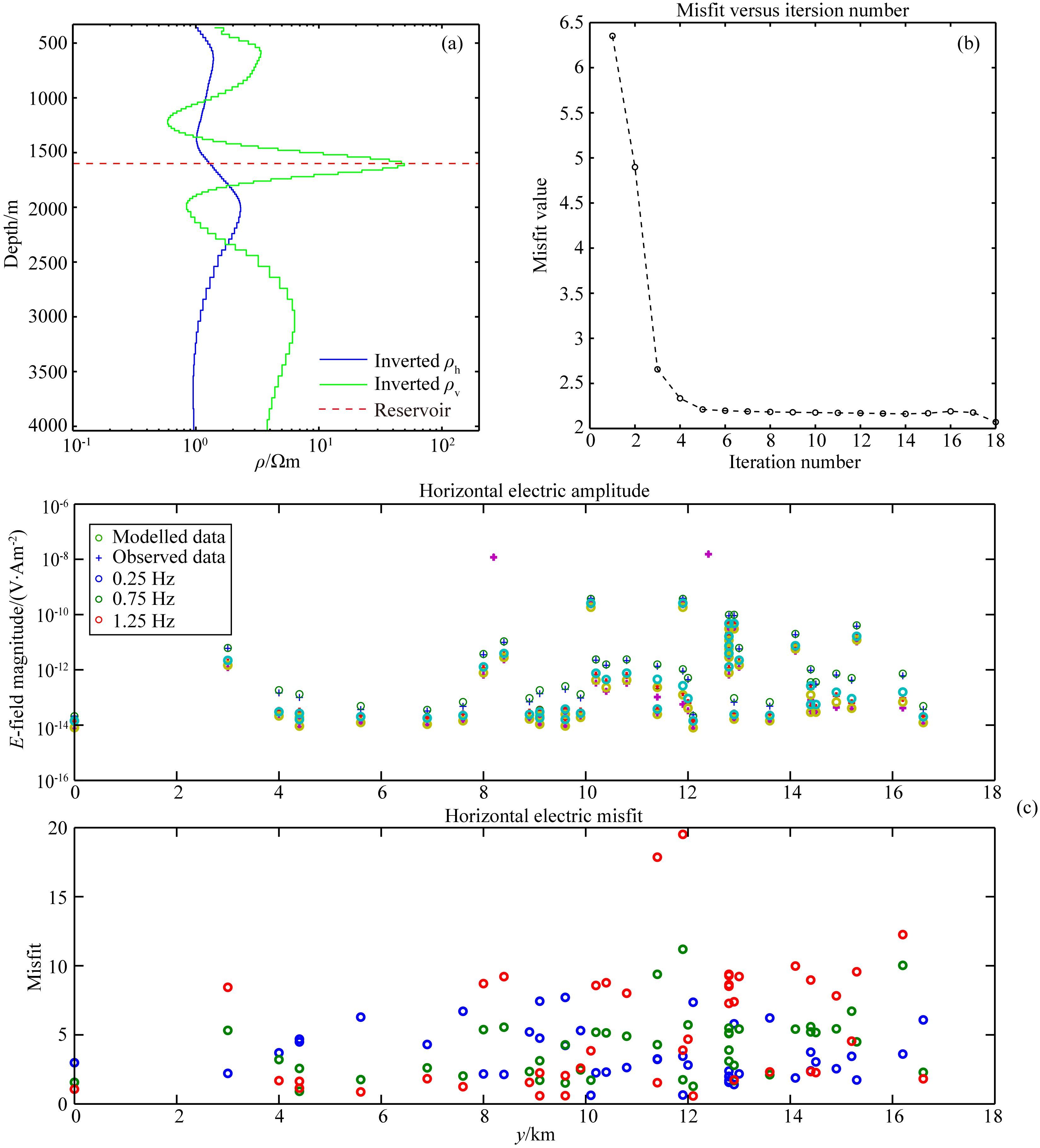 图 7为实测数据电阻率各向异性反演结果,根据地震资料分析结果,油气藏储层埋藏深度大约在1500~1600 m之间(图 7a红色虚线).由图 7a可知,在大约1600 m深度处存在垂向电阻率突然升高的高阻薄层,这与地震资料分析结果相一致,覆盖层和基岩层也呈现出了明显的电阻率各向异性.由图 7b可知,在反演迭代的前期,数据拟合差下降迅速,随着反演次数的增多数据拟合差下降速度减慢并趋于收敛,经过18次反演迭代后数据拟合差最终收敛于2.07.从水平电场拟合情况看(图 7c),除了频率0.25 Hz部分数据拟合差Dd较高外,不同收发距处反演模型电场响应与观测数据都拟合得比较好(在1.0附近).