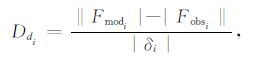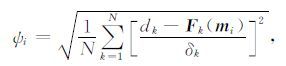 其中 ‖·‖ 为标准差, d=[d1d2…dN]T为观测数据向量(维度为N), F(m) 表示模型 m 的正演响应, Wd 为数据加权矩阵(维度为N),公式为