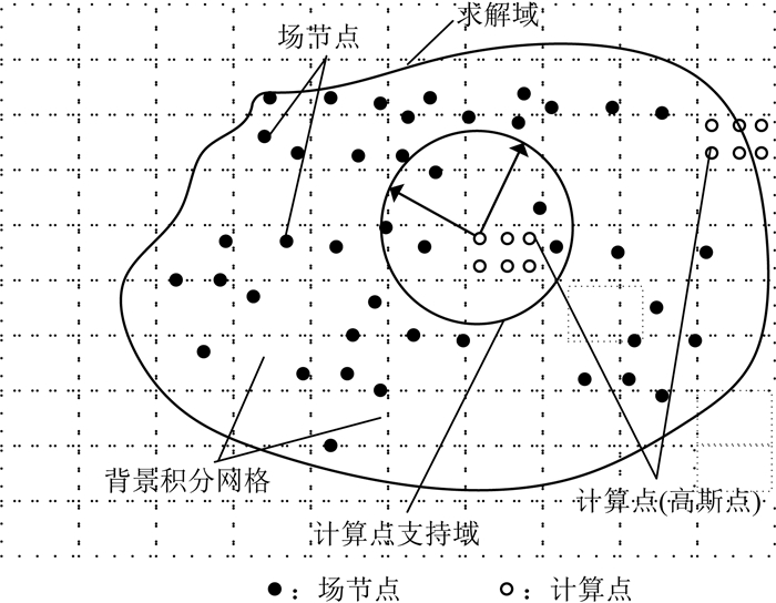 2.1 基于复合二次径向基函数的形函数构造无网格法的求解区域离散示意图如图 1所示.由于无网格法是一种不依赖于网格来构造形函数的方法,因此在无网格法中引入了支持域的概念.支持域的形状可根据计算需要和场值的变化进行设定.一般设定高斯点为计算点,若节点位于计算点的支持域内,则该场节点参与构造该计算点的形函数.