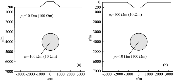 3.3 各向异性体数值模拟为了进一步分析起伏地形下含有异常体的大地电磁响应特征,分别在地垒和地堑地形中加入异常体,如图 10所示.均匀空间的背景电阻率值分别为10 Ωm,100 Ωm.圆形异常体的电阻率分别为100 Ωm,10 Ωm,异常体中心位于(0,4000 m),半径1000 m.