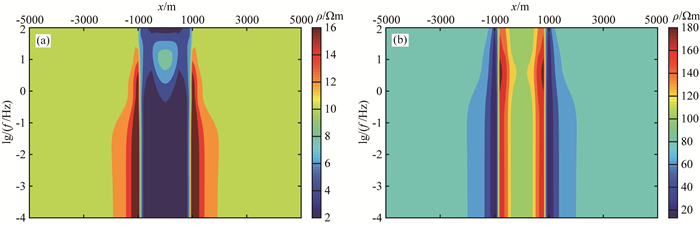 由于TE模式对各向异性以及起伏地形不敏感,为此只分析TM模式下的计算结果.根据起伏地形的研究可知,地垒地形导致TM模式视电阻率曲线表现出了低阻异常,地堑地形使TM模式的视电阻率曲线表现出了高阻异常,地垒地形中高阻和地堑地形中低阻异常的视电阻率计算结果如图 11所示.从图中可以看出,地形对视电阻率的影响明显,异常体的特征几乎表现不出来.