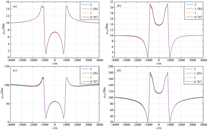 图 13 改变平行电导率不同各向异性系数下视电阻率计算结果 (a)地垒地形高阻异常; (b)地堑地形高阻异常; (c)地垒地形低阻异常; (d)地堑地形低阻异常. Fig. 13 The apparent resistivity result of different anisotropic coefficients by changing parallel conductivity (a) Horst terrain high resistivity anomaly; (b) Graben terrain high resistivity anomaly; (c) Horst terrain low resistivity anomaly; (d) Graben terrain low resistivity anomaly. |