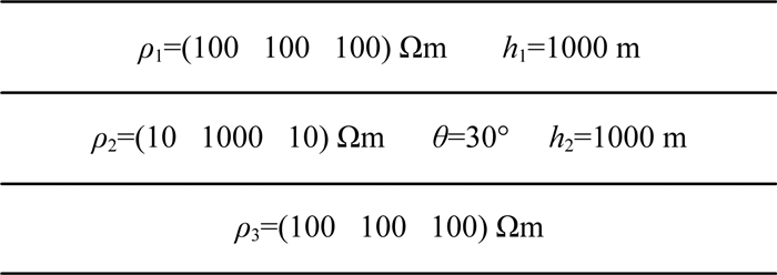 为了验证本文求解各向异性问题的正确性,建立如图 2所示的层状模型,第一层和第三层为各向同性介质,电阻率为100 Ωm,第二层为各向异性介质,平行层面电阻率为10 Ωm,垂直层面电阻率为1000 Ωm,介质的电性主轴与地面坐标系的夹角为30°.第一层和第二层层厚分别为1 km和2 km.计算区域大小为20 km×20 km.