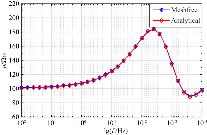 图 3为在计算区域内地面中心点处的无网格法数值解与Josef推导的拟解析解的对比图,从图中可以看出,在各个频率下无网格法数值解与拟解析解两者高度吻合.统计结果表明,无网格法解与拟解析解的均方根相对误差不超过1%,充分验证了无网格法求解各向异性大地电磁问题的正确性.