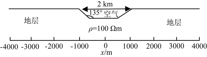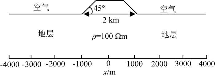 为了模拟实际起伏地形的大地电磁响应,分别建立地垒和地堑模型如图 4和图 5所示.起伏地形的宽度均为2 km,地堑和地垒的倾角均为45°.为了探究不同起伏高度下对大地电磁响应的影响规律,分别设置了500 m和200 m两种高程.横轴代表水平距离,均匀空间的电阻率均为100 Ωm.