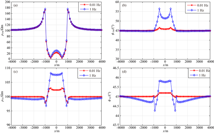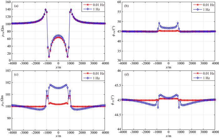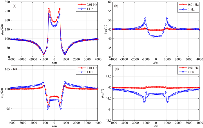 图 6 地垒地形下高程500m视电阻率和相位模拟结果 (a) TM视电阻率; (b) TM相位; (c) TE视电阻率; (d) TE相位. Fig. 6 Simulation results in height 500 m horst terrain (a) TM mode apparent resistivity; (b) TM mode phase; (c) TE mode apparent resistivity; (d) TE mode phase. |