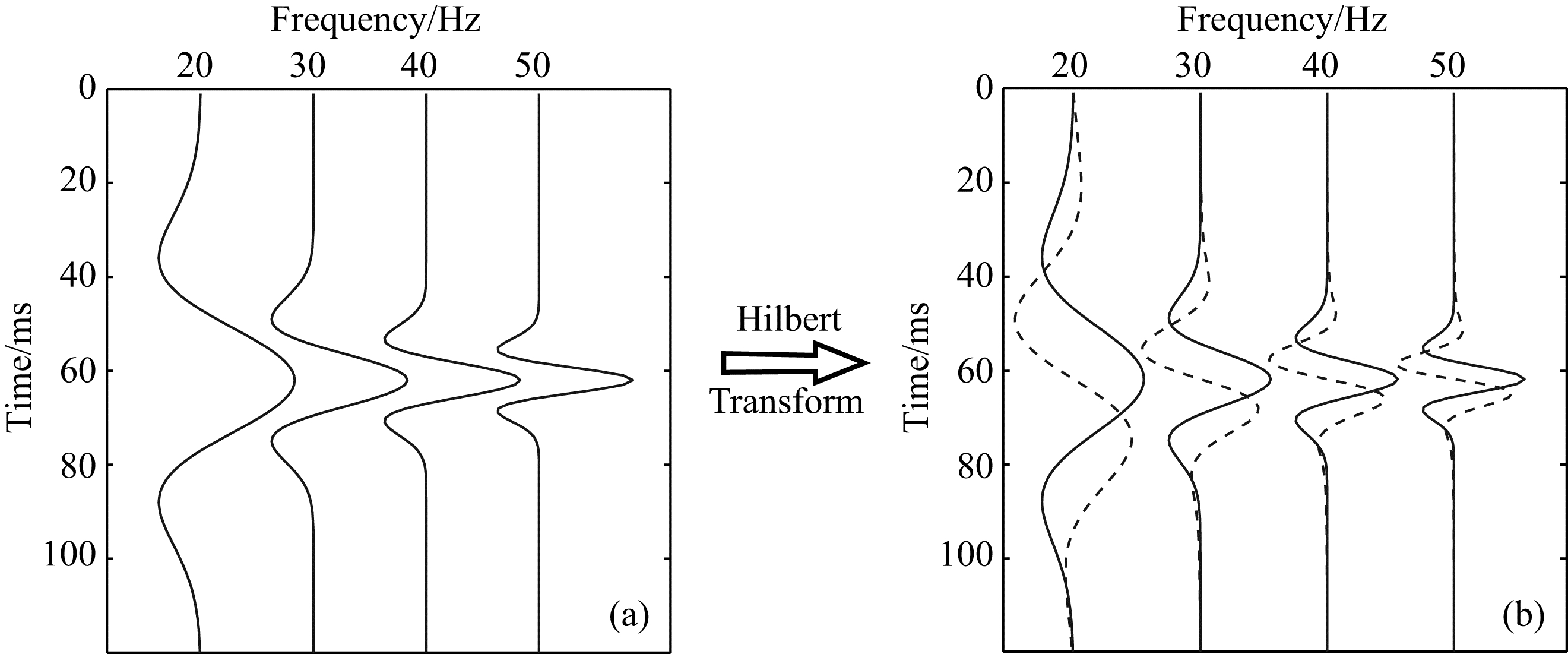 ![]() | 图 1 子波库示意图 (a) 实子波库,由不同频率的零相位Ricker子波组成; (b) 复子波库,通过对实子波库进行Hilbert变换得到,其中实线为复子波库实部;虚线为复子波库虚部.Fig. 1 Schematic diagram depicting the construction of complex wavelet library (a) The real wavelet library composed of many Ricker wavelets with different dominant frequency and zero phase; (b) The complex wavelet library constructed from (a) by Hilbert Transform. The solid lines represent the real components and the dashed lines represent the imaginary components. |