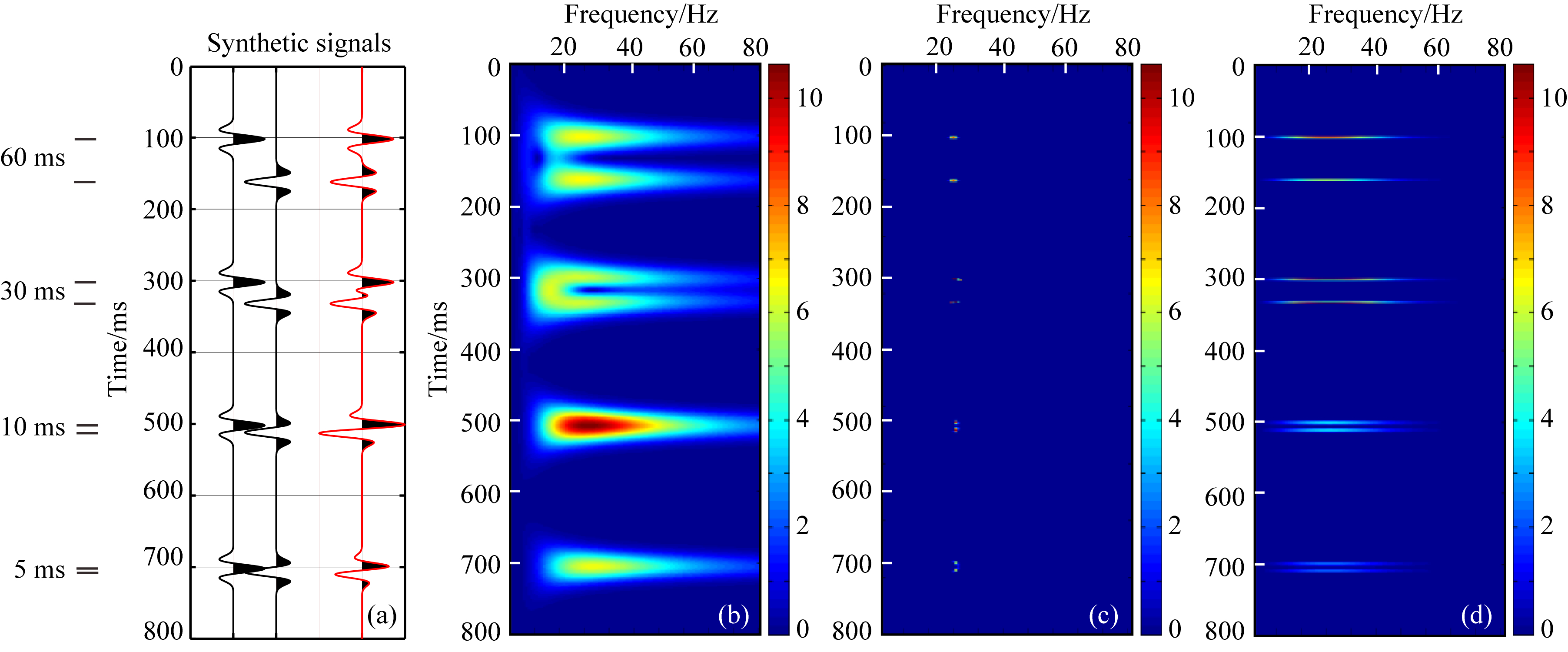 ![]() | 图 2 时频谱分解分辨薄层的能力 (a) 红线为拟合信号,是两个黑线信号的组合,用来表征不同厚度地层的顶底反射; (b) 为CWT方法得到的时频谱; (c)和(d)分别为复谱分解方法得到的时频主频谱和时频能量谱. Fig. 2 The ability of spectral decomposition in distinguishing thin layers (a) The red signal is a combination of two black signals, representing the top and bottom reflections from strata of different thickness. (b) Time-frequency spectrum generated by the CWT method. (c) and (d) are time-frequency dominant spectrum and time-frequency energy spectrum generated by the proposed method, respectively. |
