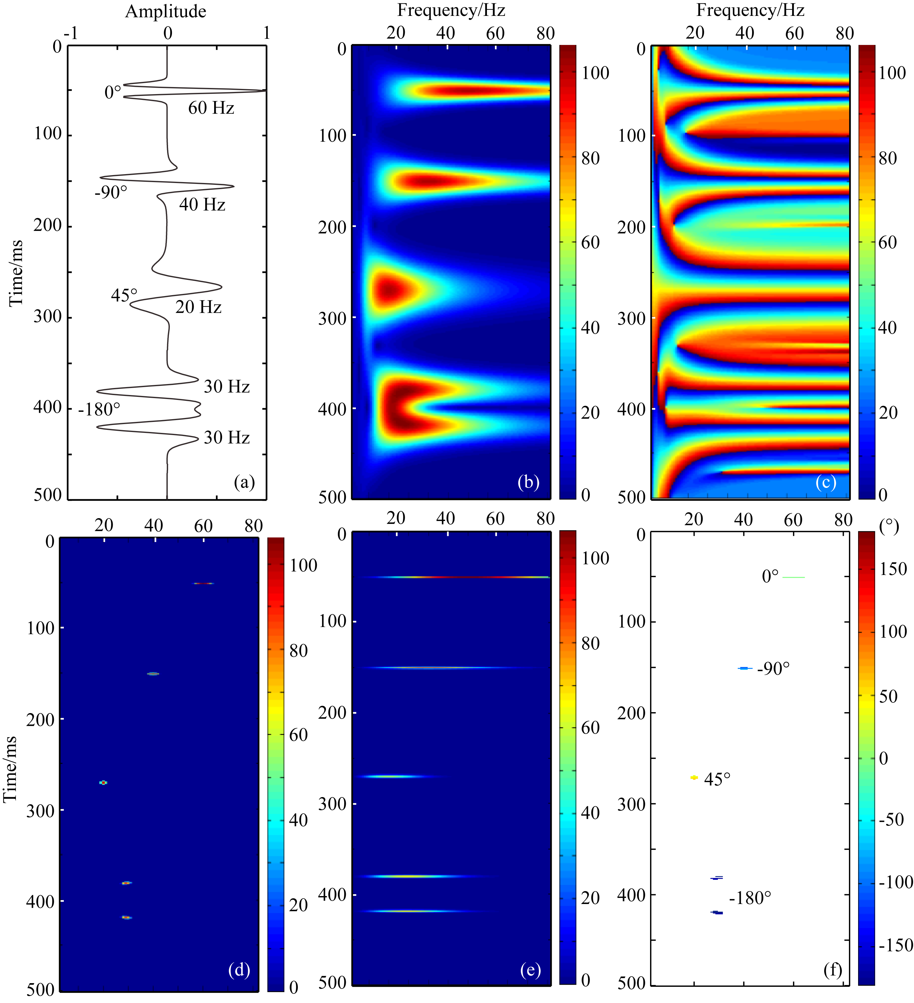 图 3为一个由不同频率和相位的Ricker子波组成的拟合地震信号例子.拟合信号的子波频率从上到下依次为60,40,20,30 Hz和30 Hz,相位依次为0°,-90°,45°,-180°和-180°.图 3b为CWT方法得到的时频能量谱,代表着常规谱分解的分辨率水平.图 3c为CWT方法得到的时频相位谱,从中难以提取与衰减有关的子波相位信息.图 3d—3f分别为地震复谱分解方法得到的时频主频谱、时频能量谱和时频相位谱.地震复谱分解得到的三种时 频分布都具有很高的时间分辨率,并且所求结果与 拟合信号真实情况一致.拟合算例表明,相对于传统CWT方法,复谱分解方法的优势不仅在于具有高时频分辨率特征,而且还在于能够准确地计算出时变子波的相位信息.