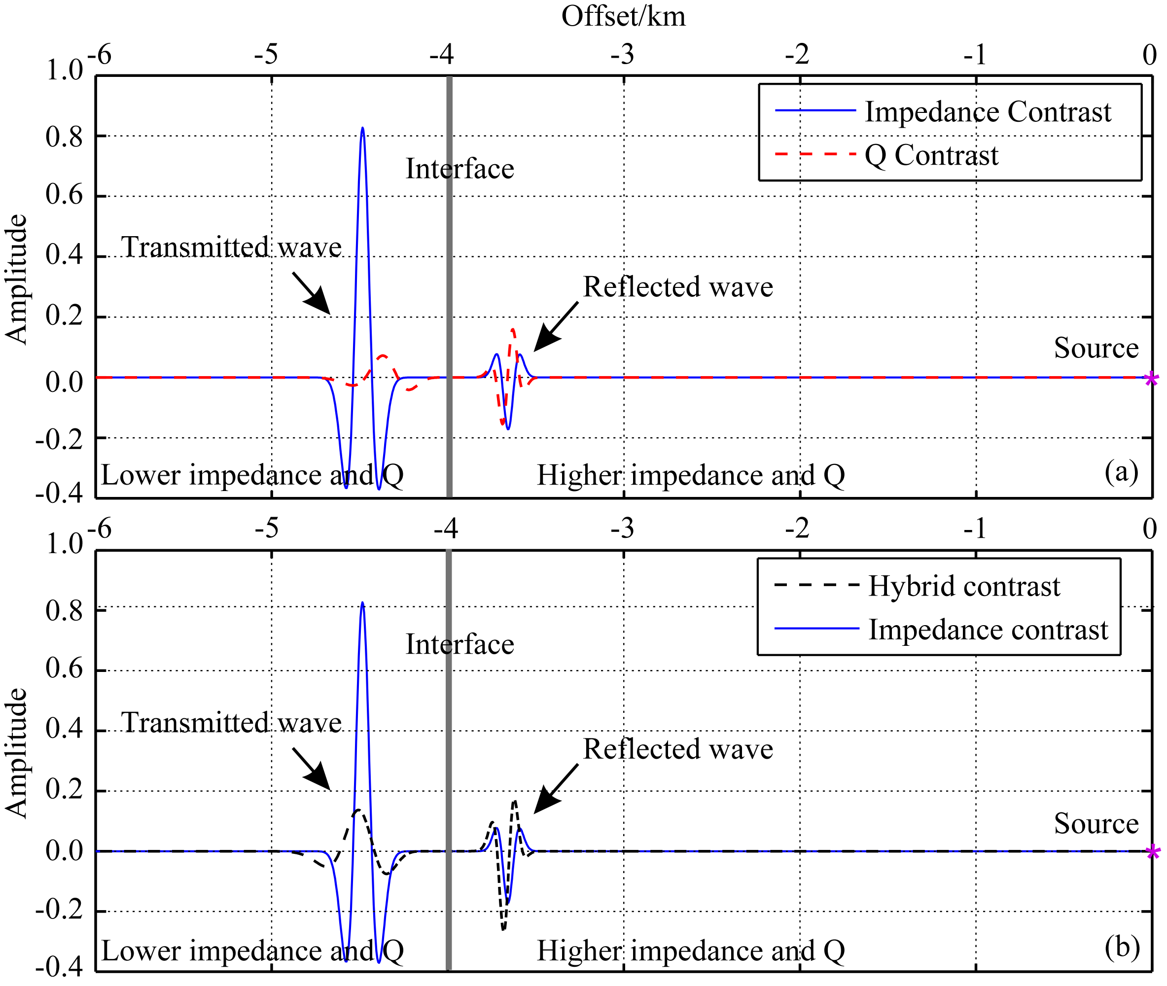 ![]() | 图 4 数值模拟分析引起相位改变的原因. 界面左侧的介质相对于右侧介质波阻抗低、衰减程度高.(a)和(b)中蓝线表示 仅考虑阻抗差异存在时产生的透射波和反射波; (a)中的红线表示仅存考虑 存在衰减差异存在时产生的透射和反射波; (b)中黑线表示同时考虑存在阻抗差异和衰减差异存在时产生的的透射和反射波 Fig. 4 Causes of wavelet phase change due to attenuation. The media on the left side of the interface has lower impedance and higher attenuation than that on the right side. The blue waves in (a) and (b) denote the reflected and transmitted wave in the case that only the impedance contrast is considered. The red waves in (a) denote the case that only the attenuation contrast is considered. The black waves in (b) denote the case that both the impedance contrst and the attenuation contrast are considered |