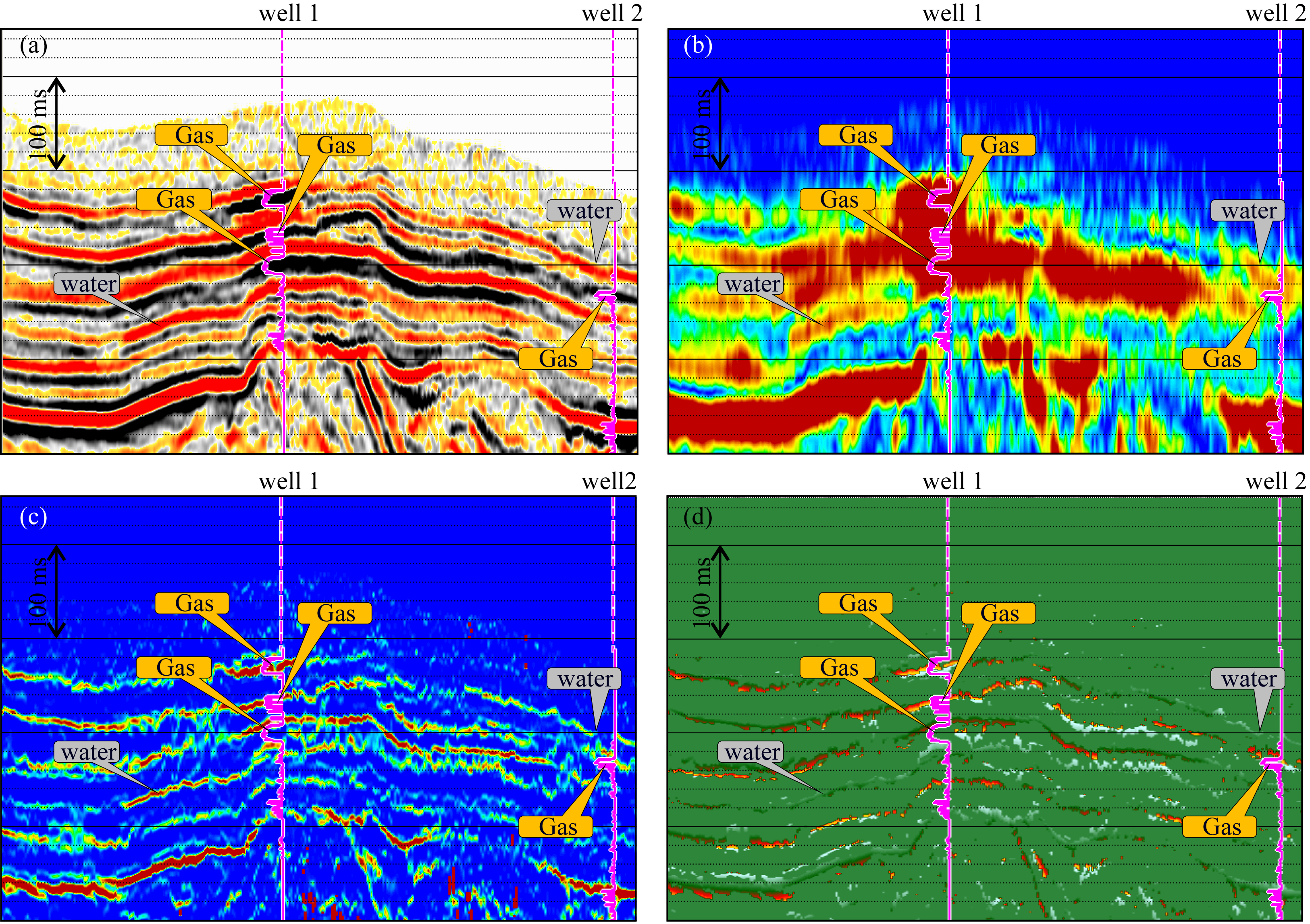 ![]() | 图 5 实际资料烃类检测算例. (a) 目标区过探井的地震剖面,所投测井曲线为含水饱和度,钻井揭示和地质解释的气层和水层位置已在图中标示; (b) CWT方法得到的 用于烃类检测的频率异常剖面; (c) 使用本文提出的复谱分解方法得到 的频率异常剖面; (d) 复谱分解方法求取的时频相位谱异常剖面 Fig. 5 A real hydrocarbon detection example. (a) A seismic connecting-wells section. The curve of water saturation curve is posted and the interpreted gas saturated and water saturated layers are marked; (b) The abnormal frequency section generated by CWT method. (c) and (d) are the abnormal frequency and abnormal phase sections generated by the complex decomposition method, respectively |