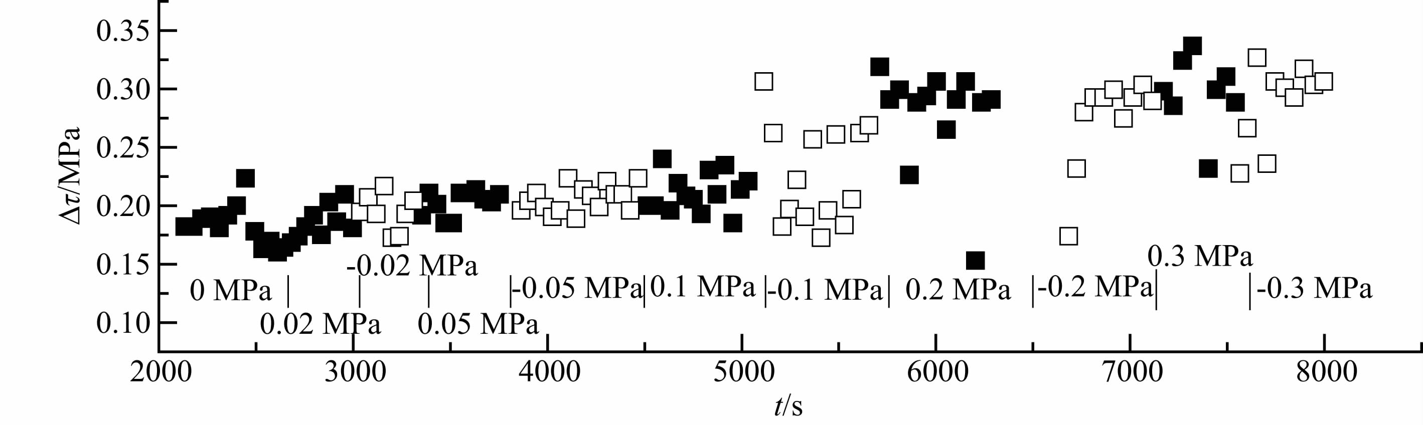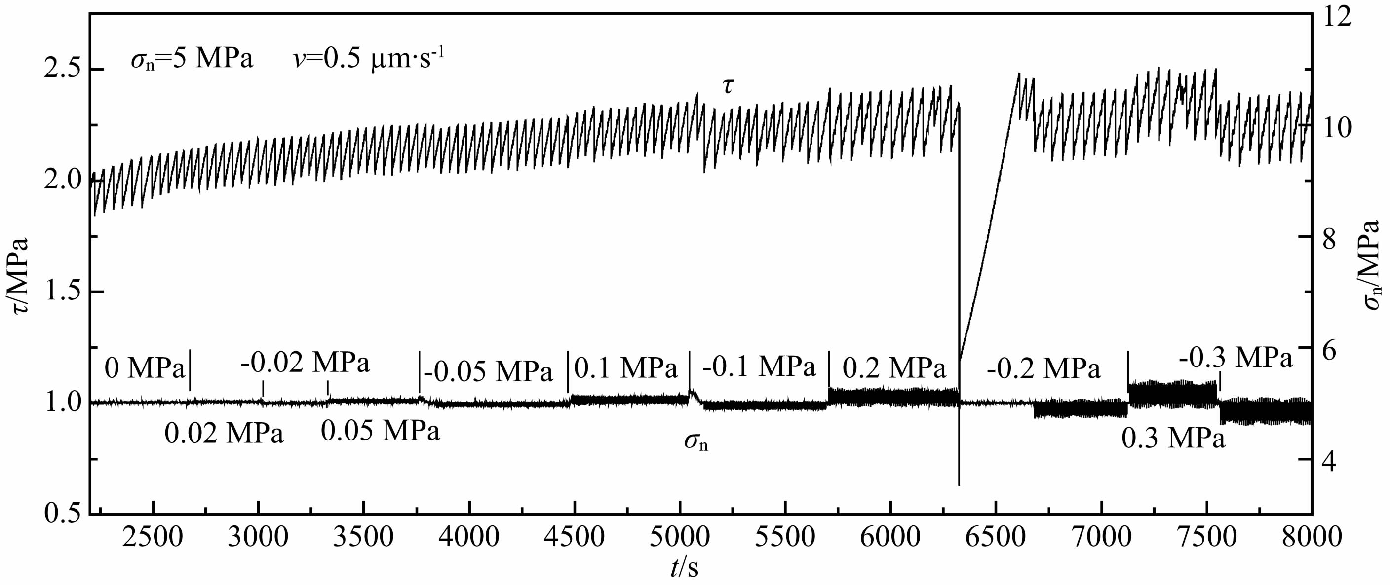 ![]() | 图 9 5 MPa平均正应力下方波状正应力扰动的剪应力-时间曲线(6300 s左右的大应力降事件为切换扰动振幅引起加载系统不稳所致) Fig. 9 Shear stress versus time for frictional experiments modulated by stress perturbation of square wave at 5 MPa average normal stress (Great stress drop happens at 6300s due to loading system unstability when switching perturbation amplitude) |