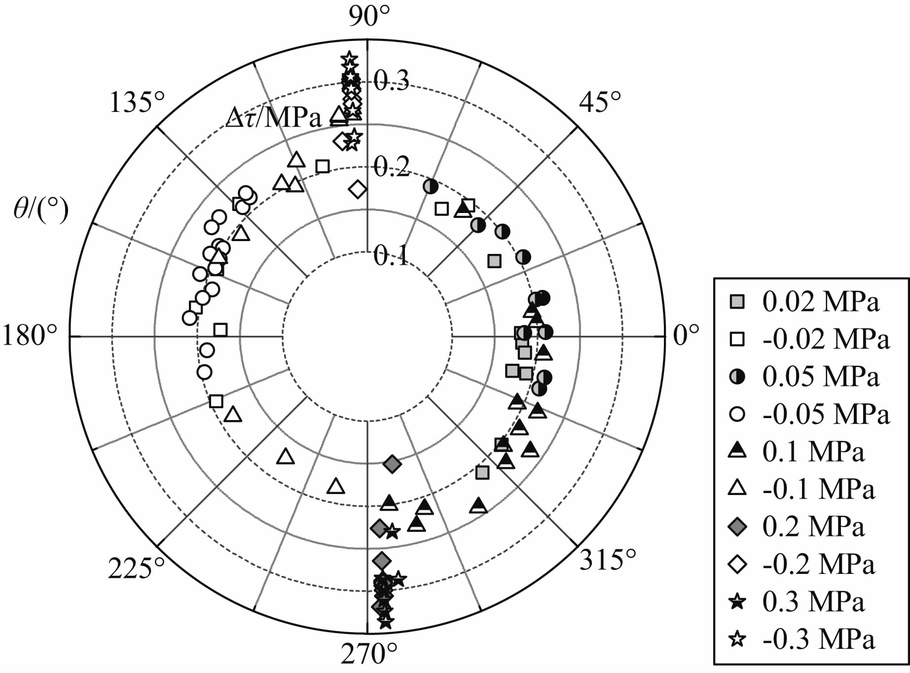 利用Schuster统计方法计算了实验中各次黏滑对应的扰动相位(图 11).计算结果显示,扰动主要发生在正应力小于平均正应力的位置,即,正扰动时,黏滑主要发生在0°~90°和270°~360°区间;负扰动时,黏滑主要发生在90°~270°区间.随着扰动振幅的增加,正负扰动的失稳相位分别向270°和90°这两个平均正应力突然下降的位置趋近,失稳时间显然受到了扰动的调制作用.正负扰动的相位呈角对称分布,说明正负扰动对失稳时刻的影响具有同等的作用.