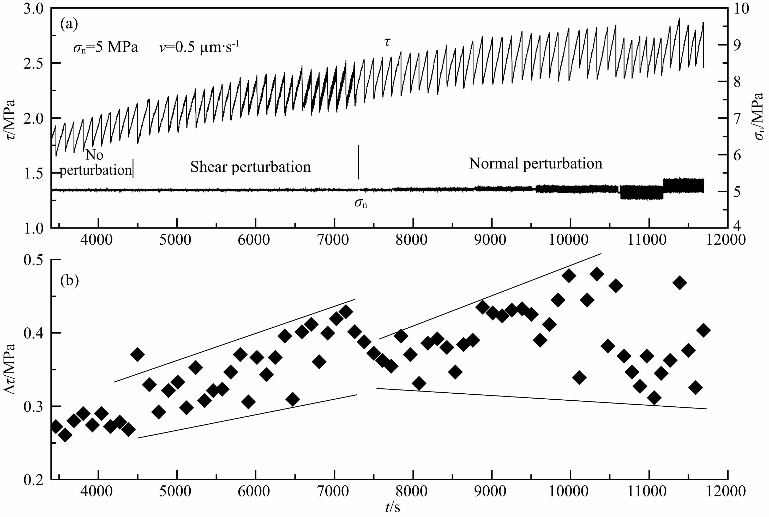 5 结论采用三块花岗闪长岩标本组成的含有两个滑动面的直剪结构开展了岩石摩擦实验,研究了正应力扰动对断层黏滑失稳的影响,并通过对比实验以及前人的实验结果分析了剪应力和正应力扰动对黏滑影响的异同,取得了如下结果和认识.
