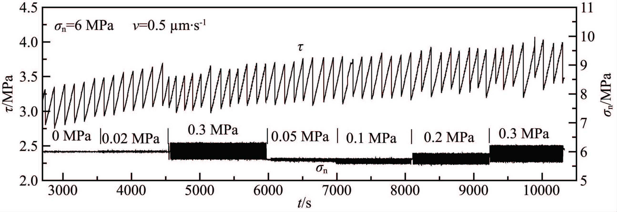 ![]() | 图 3 6 MPa平均正应力下正弦波状正应力扰动的剪应力-时间曲线 Fig. 3 Shear stress versus time for frictional experiments modulated by stress perturbation of sine wave at 6 MPa average normal stress |