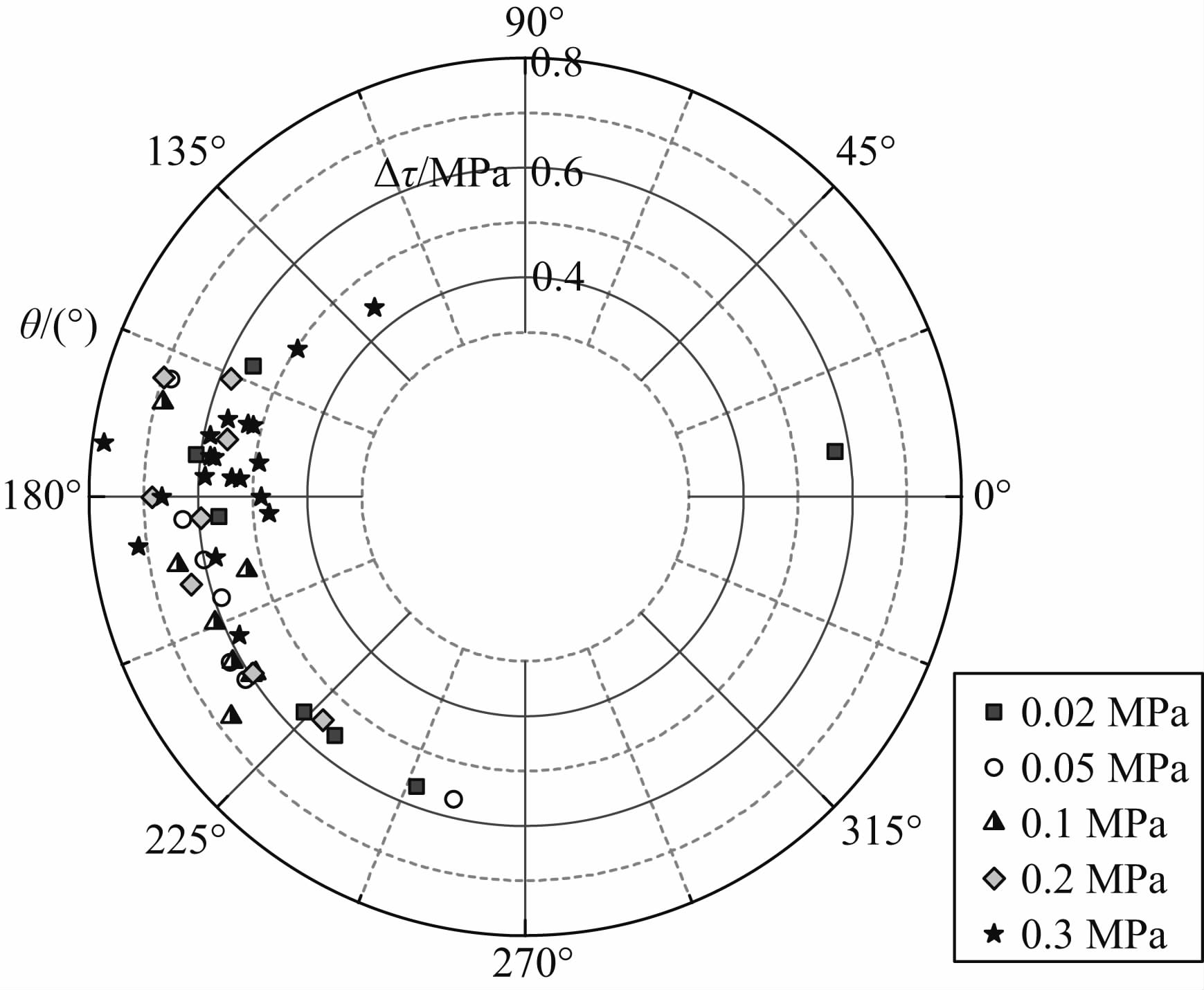 对比剪应力曲线和正应力曲线,黏滑大多发生在正应力减小的位置,说明失稳受到了扰动的调制.图 4给出了上述实验各扰动阶段黏滑事件按Schuster统计方法给出的相位分布图.当扰动振幅为0.02 MPa时,失稳相位随机分布,几乎布满整个角度区间(0°~270°);当扰动振幅增加到0.05 MPa时,失稳相位变得相对集中,主要分布在第3项限,表明失稳多发生在平衡位置以下(正应力减小);当扰动振幅为0.1 MPa和0.2 MPa时,失稳相位的分布进一步集中,幅度逐渐缩小,平均值在180°(正应力最小)附近摆动;当扰动振幅达到0.3 MPa时,所有黏滑几乎都发生在扰动处于波谷的位置(180°).总体而言,各扰动振幅失稳相位的波动范围随扰动振幅的增加而减小,而失稳优势相位则随扰动振幅的增加向180°趋近.