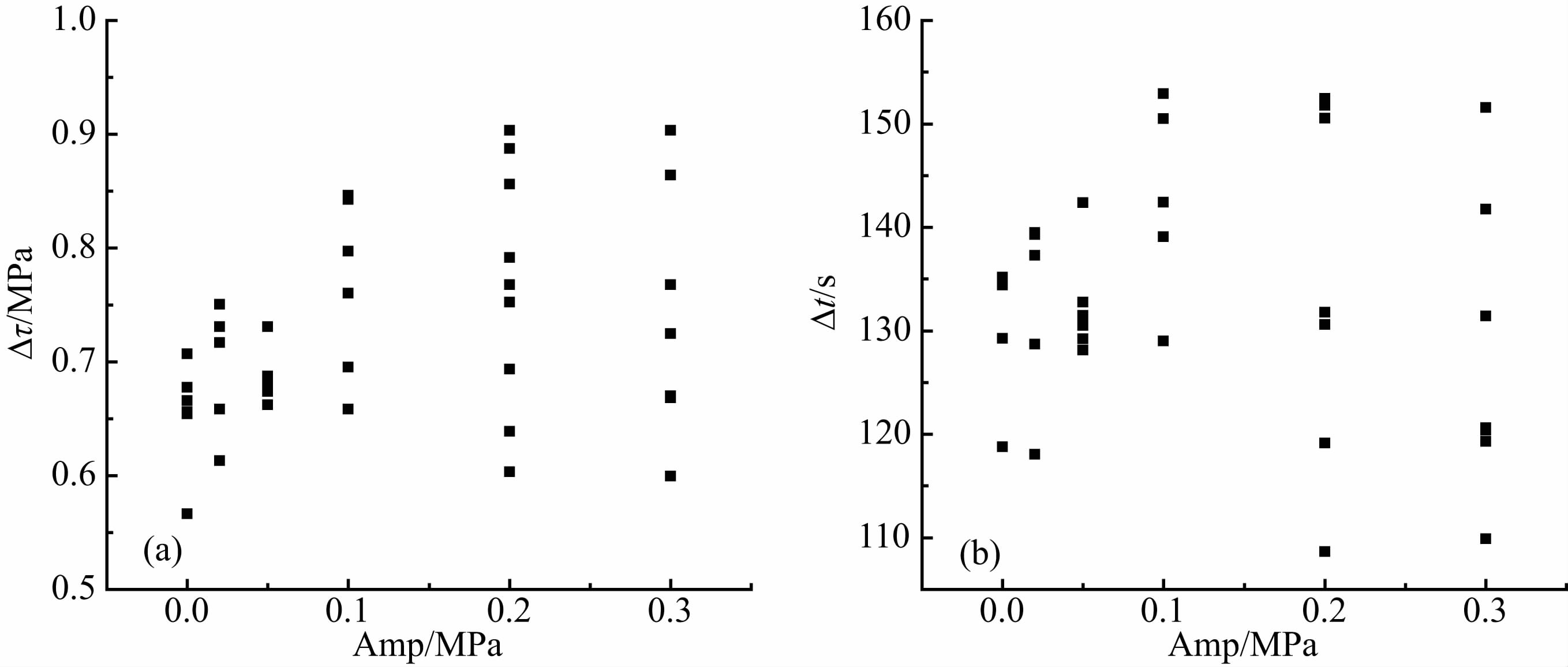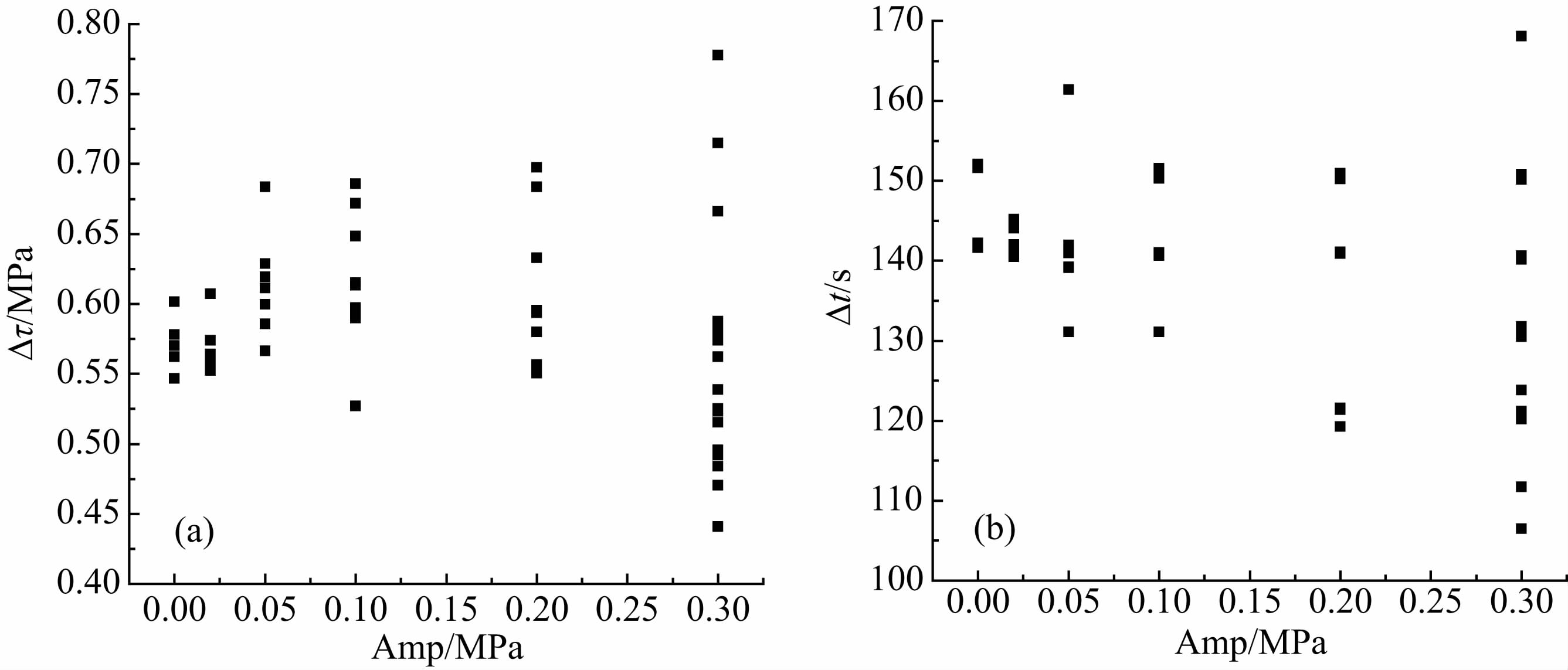 ![]() | 图 7 黏滑应力降(a)和黏滑时间间隔(b)随扰动振幅的变化(11 MPa) Fig. 7 Stress drop (a) and time interval (b) of stick-slip events versus perturbation amplitude (11 MPa) |