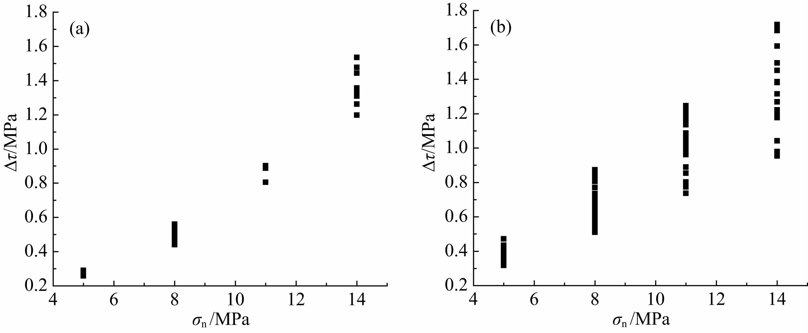 图 8 黏滑应力降随平均正应力的变化 (a) 无扰动; (b) 叠加扰动. Fig. 8 Stress drop of stick-slip varying with average normal stress (a) Constant average normal stress; (b) Modulated stress perturbation. |