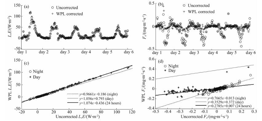 图 1 潜热通量(a, c)和碳通量(b, d)的WPL订正(2008年11月1—6日,3日除外) Fig. 1 WPL correction of latent heat flux (a, c) and CO2 flux (b, d) (1—6 Nov 2008 except 3rd) |
