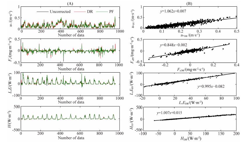 图 2A为原始、DR和PF得到的观测资料经过超声虚温订正和WPL订正后的u*、Fc、LvE和H的对比.不同坐标旋转方法对Fc、LvE和H的结果影响很小;坐标旋转剔除了仪器倾斜引起的侧向应力的影响,DR和PF分别使u*减小6%和3%.图 2B比较了两种坐标旋转方法得到的通量值,可以看出,两种方法的H和LvE相差不多,PF得到的Fc较DR偏低,而PF得到的u*比DR高6.18%,这表明两种坐标旋转方法得到的三维风速有较大差异.