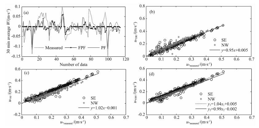 图 4 三种坐标旋转对比 (a) 未订正、PF订正、FPF订正垂直速度比较; (b) DR、(c)PF、(d)FPF对u*订正结果. Fig. 4 Comparison of three coordinate rotations (a) Vertical velocity without correction, with PF correction and PDF correction; (b) u* with DR correction;(c) u* with PF correction; (d) u* with FPF correction. |